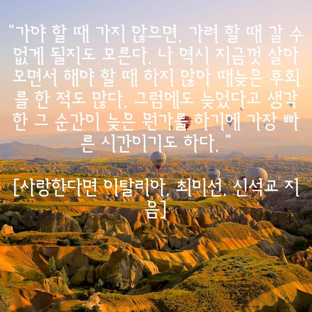 그나저나 왜 인도에 사시던 작가님은 이탈리아로 가셨을까. 계획했던 이탈리아 일주 가족여행을 상황이 받쳐주지 않아 접어두었는데, 자꾸 오라고 손짓하시는 것 같다. 이 또한 인연인 것일까. 나는 이탈리아에 가야 할까? 언제 갈 수 있을까. 후회하고 싶지 않은데.. 여행을 계획하며 읽던 숱한 이탈리아 에세이들이 있었는데, 오늘은 집에 있는 이탈리아 책, ‘이탈리아, 지중해의 바람과 햇살 속을 거닐다..’ 책을 꺼내보았다. 조만간 책 속으로 이탈리아 여행을 해야겠다.