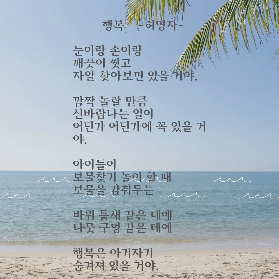 사람들은 보물찾기 하듯 행복을 찾는다. 샅샅이 뒤져보는데, 행복은 가까이에 있어도 멀리 있어도 내가 관심을 갖고 보지 않음 그냥 지나쳐 버리는 감정이기에, 못 느끼고 지나가는 행복도 분명히 존재할 듯하다