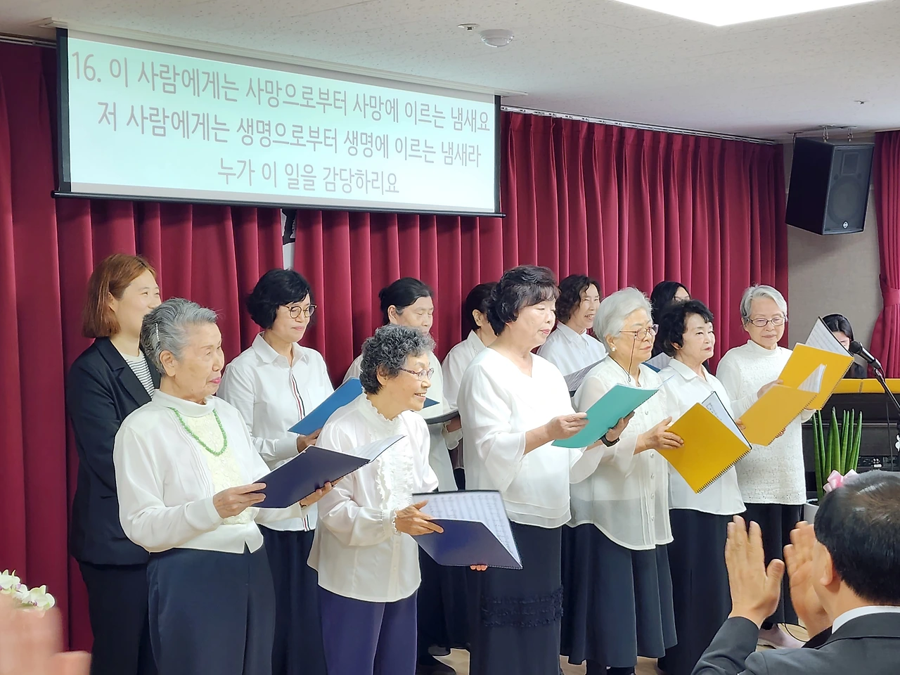 사회자의 소개로 시작한 합창반원 모두는 천상의 하모니였다. 흰색의 블라우스와 검정치마는 각을 맞추고 강당의 열기는 환하게 날아올랐다. 누가 노인이라 말할 수 있는가? 86세의 거장은 20여 살의 나이도 친구가 쉽게 되었다. 목을 풀기 위해 준비해 온 쵸코렛의 달콤함을 나누고 서로에게 먹여준다. 이미 풍성한 삶이 무엇인지 알고 있는 듯하다. 하하, 호호, 깔깔 저리도 좋을까 나도 모르게 웃는 소리를 보탠다. 한 음 또 한 소절 모두의 마음 되어 퍼져나간다. 모두가 보석처럼 빛난다.