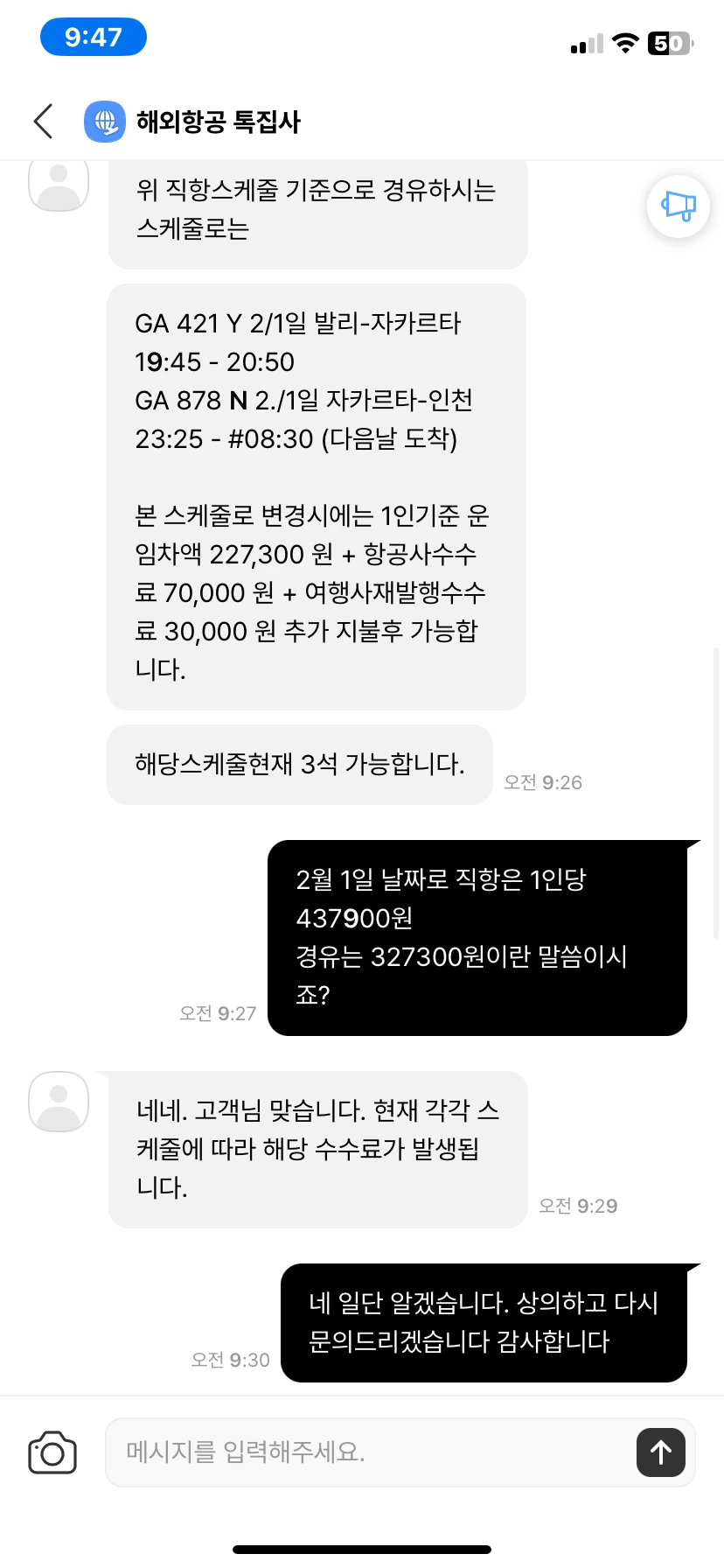 고민 끝에 왓츠앱이라는 어플을 통해 배를 예약할 수 있는 곳과 번역기를 돌려가며 이야기한 후, 왕복 프라이빗 픽드롭까지 포함하여 25만 원 정도 금액에서 길리 출발 이틀 전에 예약을 했다. 그냥 카카오톡에서 대화를 나누는 것처럼 이야기한 후 내용정리해서 보내주셨고 후불결제라 돈도 내지 않아 뜯길 걱정 없다며 안심하면서도 예약이 잘 된 건지 미심쩍고 불안했다.