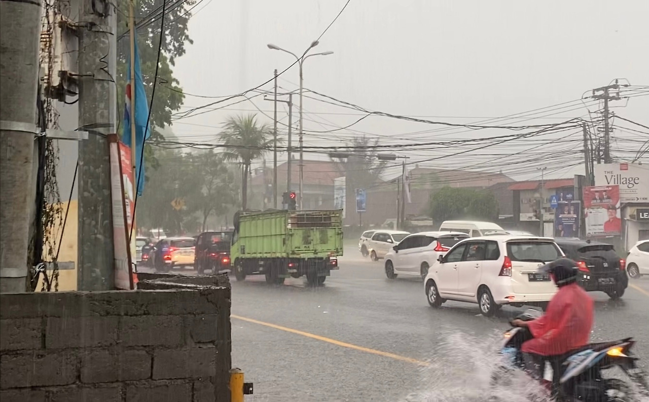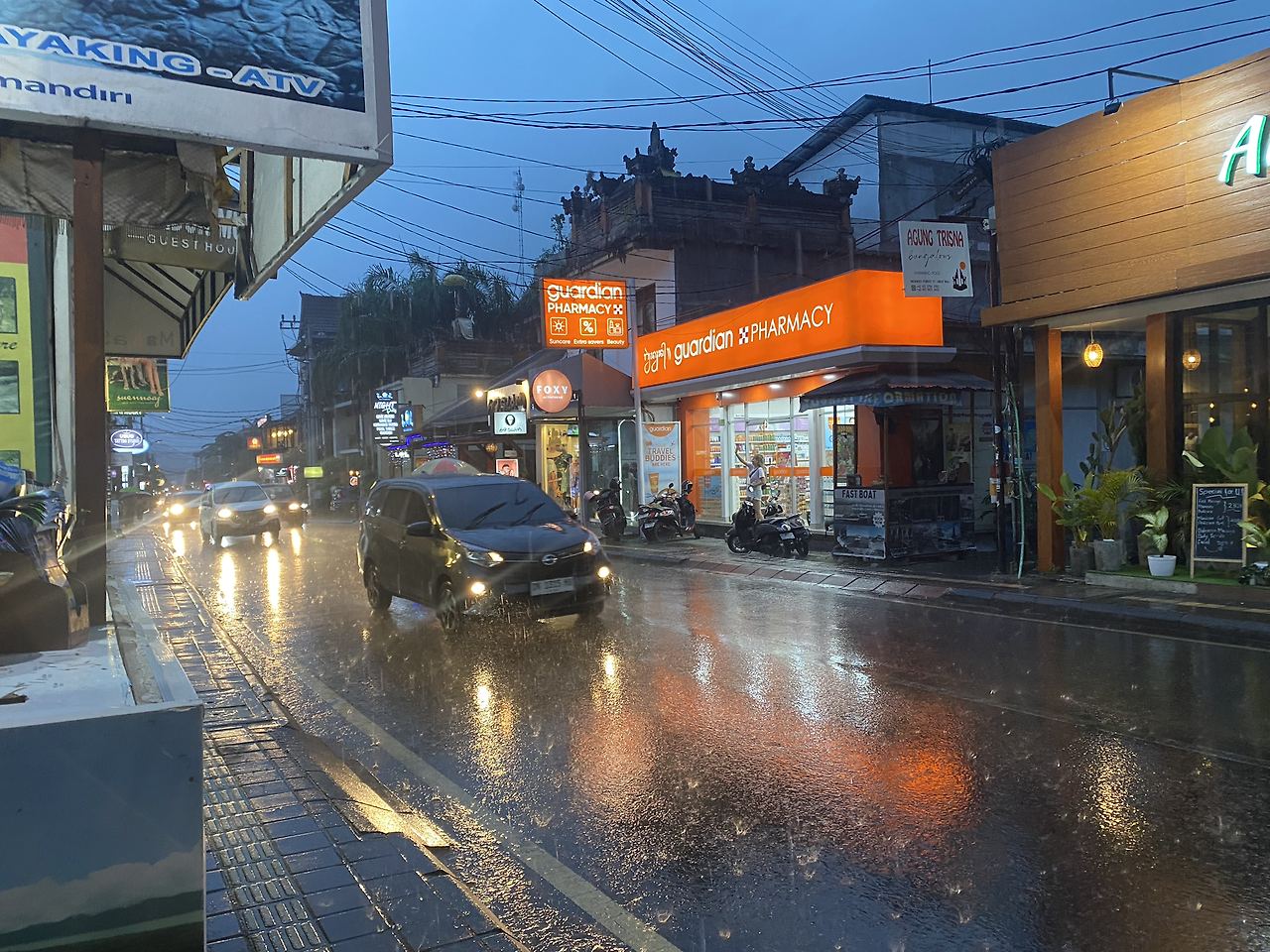 우붓 다음, 마지막으로 간 사누르라는 지역에서도 하필 한식을 먹겠다고 한식집에 갔다가 또 비를 맞이하게 되었는데 그땐 더 어마어마하게 비가 쏟아졌고 다행히 우비를 챙겨 비가 좀 그치면 가려는데 우리 집 남자들은 무슨 정신인지 굳이 억수같이 쏟아지는 비를 맞으며 가겠다고... 발리에 와서 본 제일 넓은 도로는 비로 침수되었고 인도도 보이지 않았다.