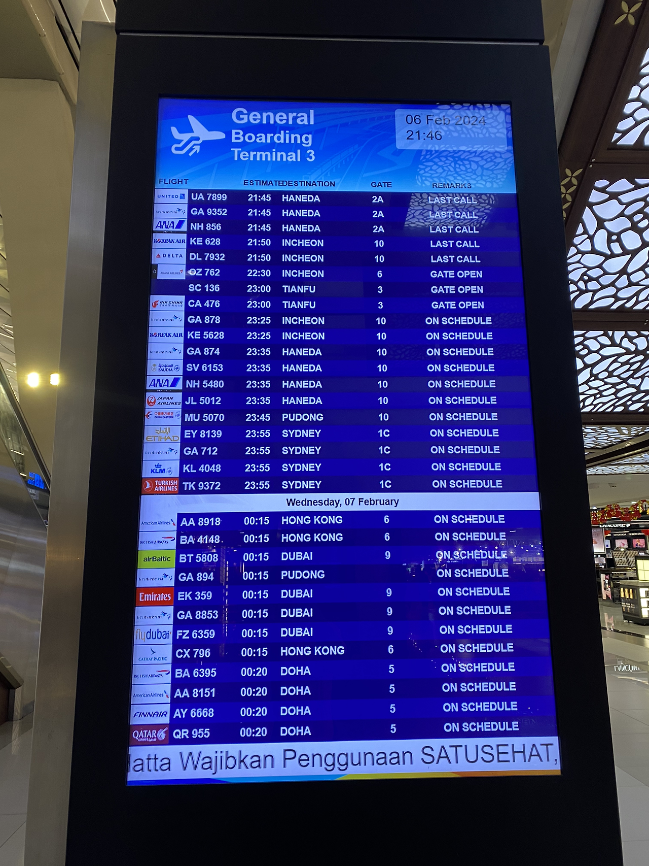 발리 국내선 공항에서 18시 40분에 출발하여 19시 40분에 자카르타에 도착한 후에 (인도네시아에서도 시차가 생겨 2시간 비행이었으나 도착시간은 1시간 걸리는 것처럼 보인다.) 3시간 45분 대기했다가 23시 25분에 자카르타 국제공항에서 타서 다음 날 8시 30분에 인천 도착예정이었다.