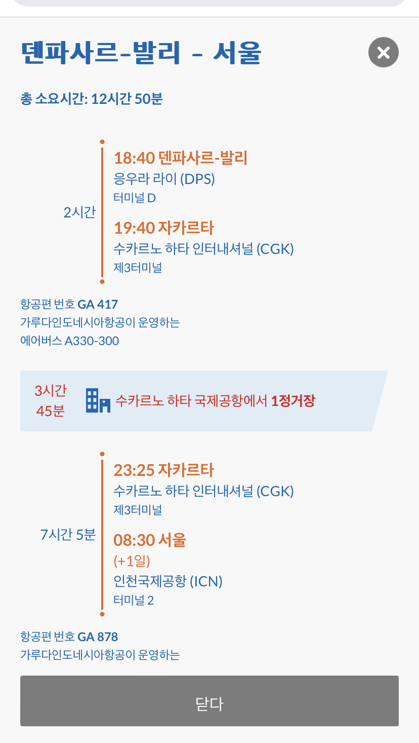 우리는 저녁에 비행기를 타야 했는데... 가루다 항공이 핫딜로 떴을 때 고민하다가 결국 표들이 사라지고 추후에 선택한 것이 발리로 갈 땐 직항, 한국으로 갈 땐 자카르타 경유였다.