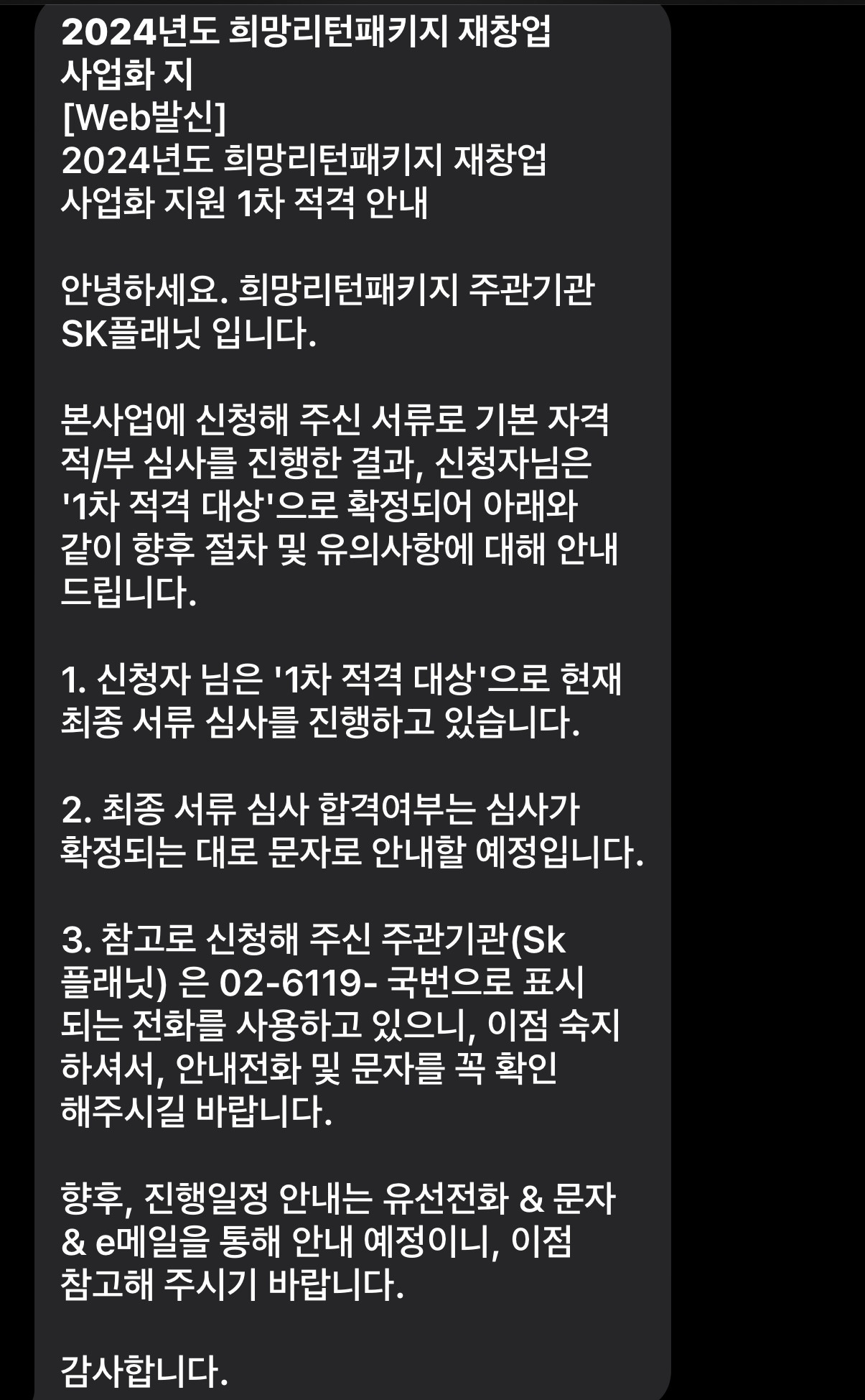 그리고 며칠이 지나지 않아 희망리턴패키지에서 문자가 또 왔다.
