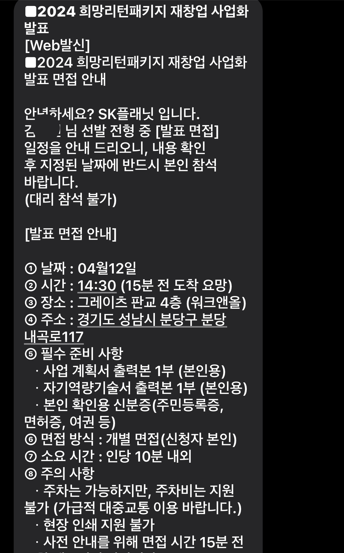 그리고 재창업사업화 업체가 경기도에는 3곳이 있었는데 유일하게 내 전화를 받아준 SK플래닛... 집에서 거리가 있음에도 사실 면접 보러 오라고 할지 모르고 시작한 것도 있긴 했다. 그런데 분당으로 가야 하네...