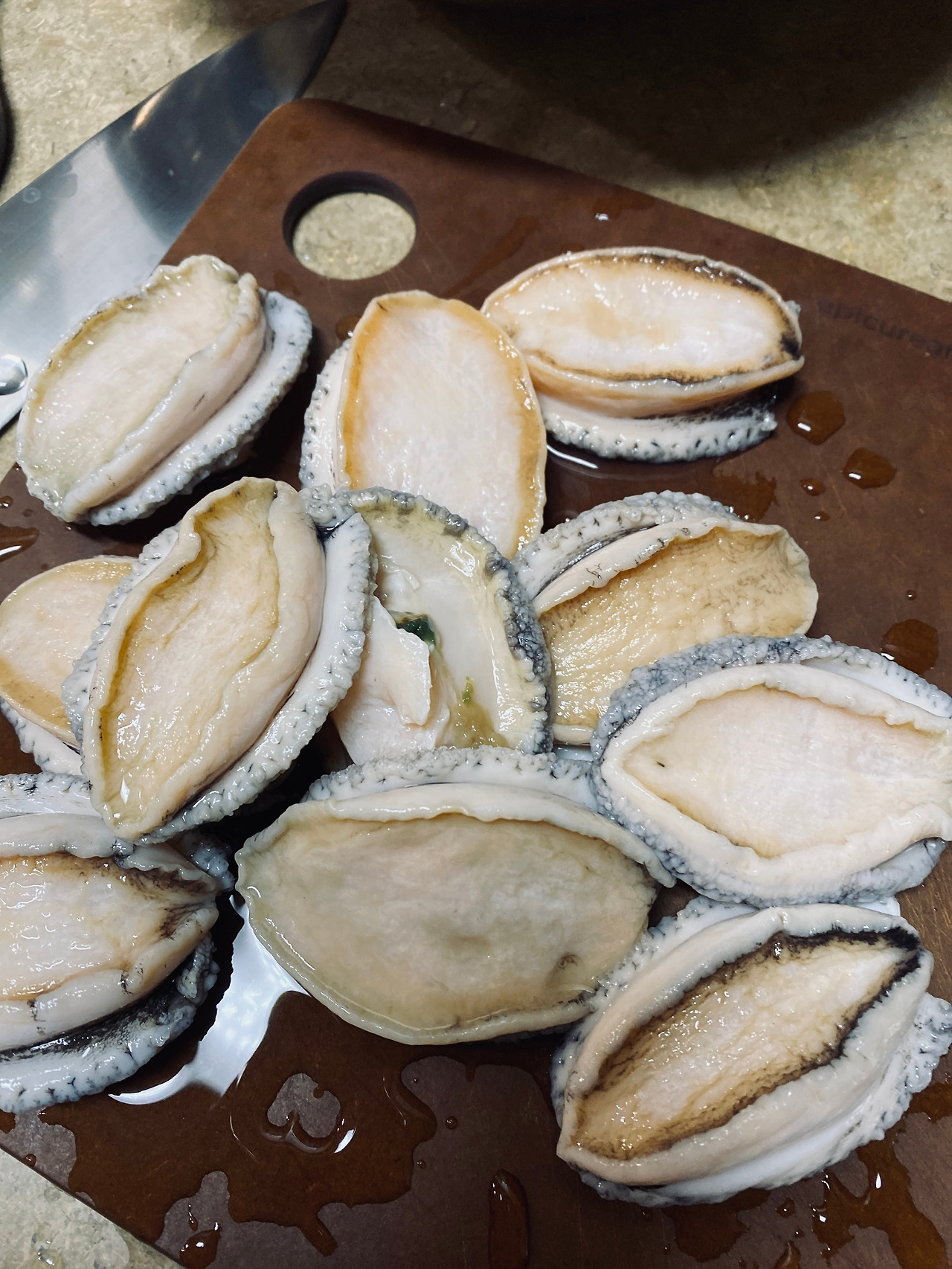식은땀이 줄줄 흐르고 전복은 또 왜 그리 많은지 총 11마리를 미친 듯이 해치웠다. 뭔가 하얗게 된 게 더 징그럽게 느껴지고 저걸 또 잘라야 하는데 내가 죽여서 그런지 전복이 쪼그라져 있었다.