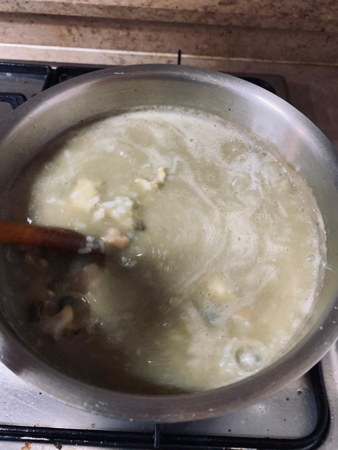 생각했던 것과 비슷한 레시피를 다시 살펴보며 참기름을 두르고 다진 마늘, 내장 넣고 볶고, 잘라놓은 전복도 넣고 미리 불려 놓은 찹쌀도 넣고 물도 넣었다.