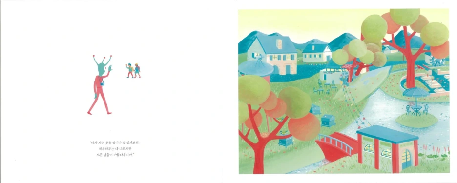 그림책의 한 페이지, 한 페이지마다 아저씨의 추억이 어린 마을의 풍경이 가득하다. 그리고 외계인 가족들이 마을에 내려와 이웃에서 살게 되면서 서로를 돌보아주고 함께 시간을 보내는 모습을 보여준다. 우리도 외계인과 같은 이웃을 만나 살고 있다. 서로를 이해하기 어렵고 각자의 생각이 전혀 다른 사람들과 어울려서 말이다. 서로를 챙겨주고 사랑하다보면 그들이 가족이 되기도 하니까. 에메아저씨는 떠나기 전 외계인 아이에게 사진기와 사진첩을 남겨준다. 그 사진기로 마을을 담아내며 아이는 에메아저씨의 말을 떠올린다.