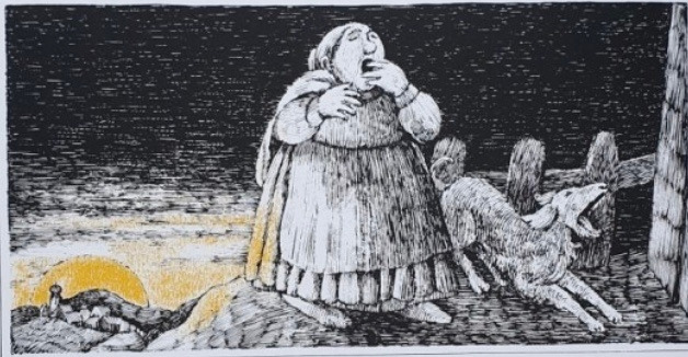 그림책의 첫 페이지는 작은 창의 커튼 너머로 밖을 내다보는 할머니의 얼굴이었다. 그건 또다시 시작된 밤과의 전쟁을 위한 비장한 얼굴이기도 했다. 힐드리드할머니가 밤을 없애기 위해 한 노력은 대단했다. 빗자루로 쓸려고도 하고, 삼베자루에 꾹꾹 담으려고도 한다. 가마솥에 펄펄 끓여 날려 보내기도 하고, 칡을 모아 꾸러미로 묶어 보기도 한다. 그것도 모자라 가위로 자르기. 침대 속에 쑤셔박기, 촛불로 태우기, 자장가 불러 재우기, 주먹질, 때리기, 파묻기, 침뱉기까지 할 수 있는 모든 일을 해본다