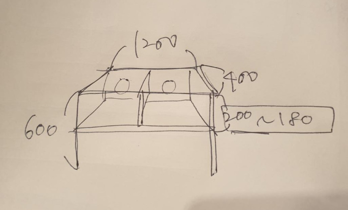 그다음은 디자인. 텔레비전이 크지 않기 때문에 상판을 지나치게 크게 할 필요는 없었다. 높이는 소파에 앉아서 보기 좋은 정도면 됐는데, 전에 책꽂이를 놓고 썼을 때 적당했기 때문에 그대로 맞추면 됐다. 수납은 두 칸으로 해서 텔레비전 셋탑박스를 놓게 하고, 아래 부분은 답답할 수 있으니까 비워서 벽이 보이게하는 게 좋겠다는 생각이 들었다. 나름대로는 복잡한 고민 끝에, 원하는 것을 최대한 넣어서 디자인한 것을 드렸다. 아주 단순한 그림이었다.