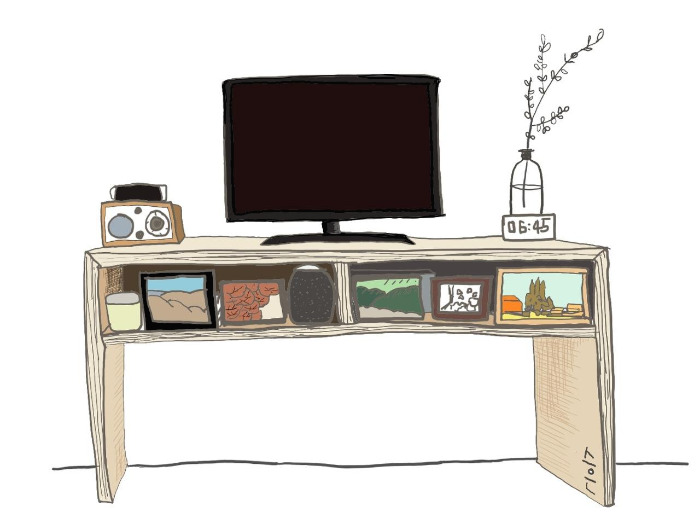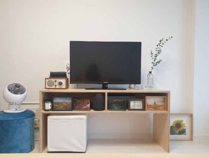 이사한 후에 거실에 TV장이 제자리를 잡았다. 셋탑박스의 높이를 측정하여 설계했기 때문에 높이가 딱 맞았다. 콘센트를 연결한 멀티탭은 뒤로 빼고, 갈 곳을 잃었던 작은 액자들을 쭉 전시했다. 액자들도, 셋탑박스도, TV도 제자리를 잡았다.