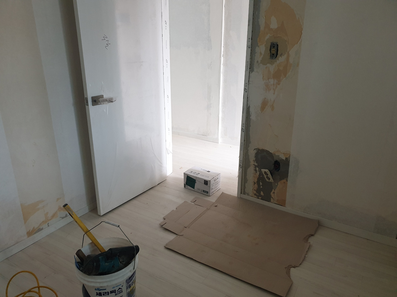 짧고 굵은 답변. 리액션은 좀처럼 없으셨다. 또 신뢰가 간다. 다 되어간다는 연락을 받은 것은 세시쯤. 집이 좁으니 혼자서 뚝딱 다 금방 끝내셨다. 마무리하는 모습을 보니 솜씨가 대단. 코너 마감을 하는데 아주 작은 차이도 그냥 넘어가지 않으신다. 마루 사장님의 실력은 나중에 에어컨 배관을 연결해주시는 분들이 왔을 때 또 확인되었다. 마감이 굉장히 깔끔한데, 이렇게 마감을 해 주는 집은 좀처럼 볼 수 없다고. 게다가 셀프인테리어의 경우엔 매우 드물다고 하셨다. 박 팀장님도 시간이 지난 후에 더 감사한 마음이 드는 좋은 작업자셨다.