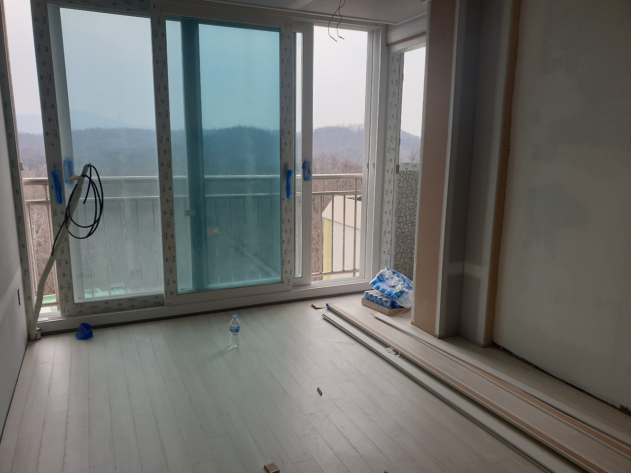 “바닥 중 제일 높은 곳과 제일 낮은 곳이 단차가 5센티가 나요. 거기다가 수평을 맞춘다고 시멘트를 깐 다음에 타일까지 얹으면 낮은 곳은 8센티가 높아지고 아마 베란다 쪽은 너무 바닥이 위로 올라오게 될 거예요. 아무래도 타일 깔기가 어려운 집이네요. 게다가 작은 방은 수직 단차가 있는 데다가 3센티나 단차가 있어요”
