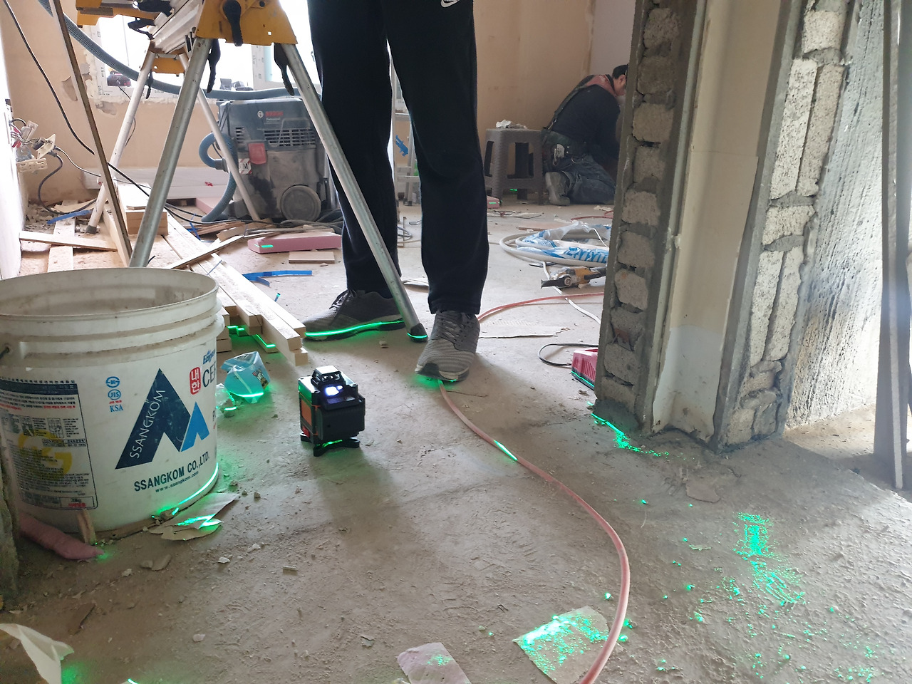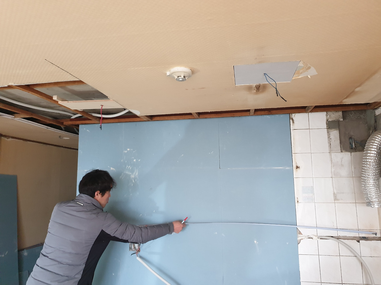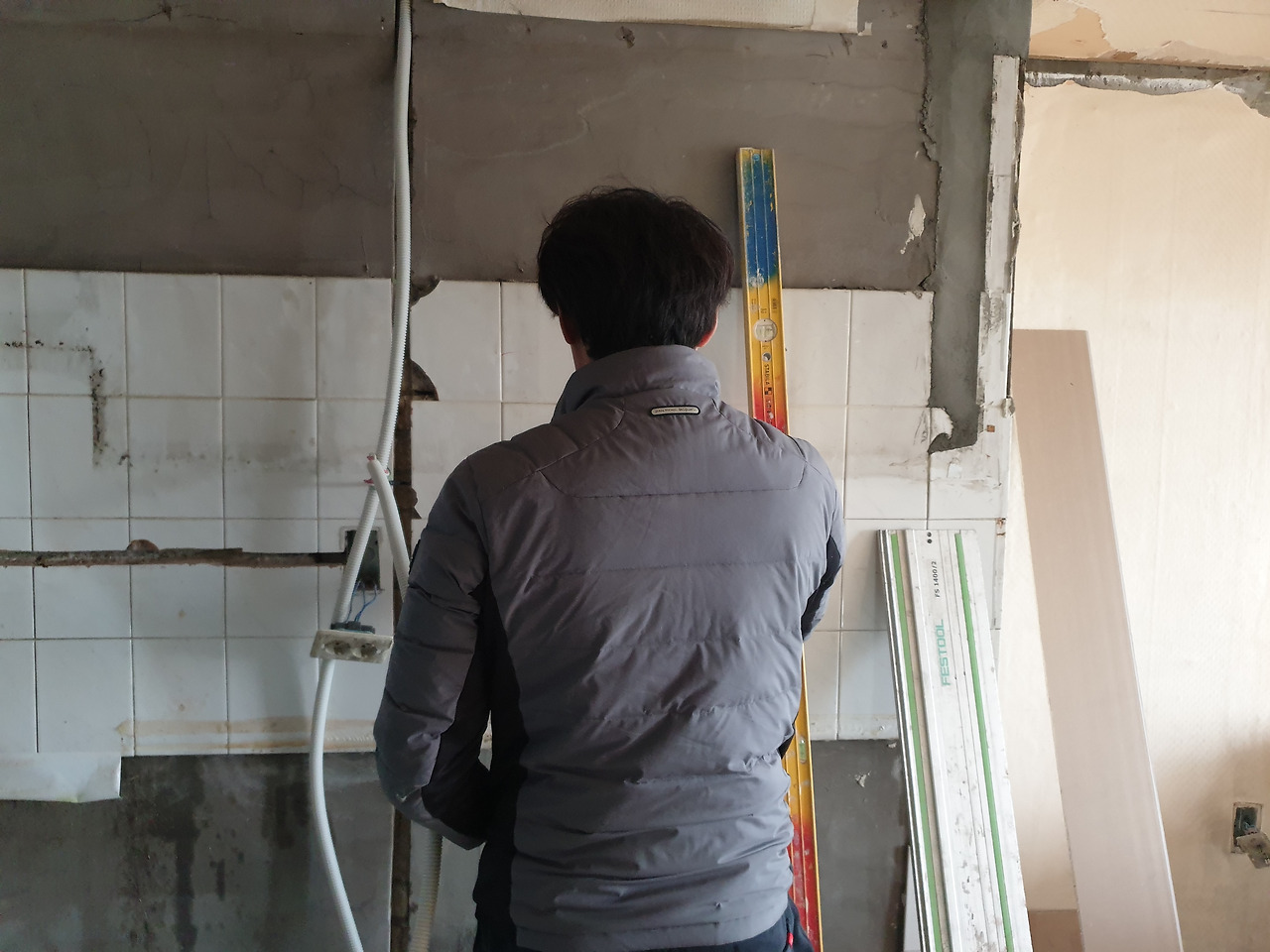 스무 살 때부터 타일작업을 해 오신 한 사장님은 베테랑 중에 베테랑이시라고 했다. 목공이 시작되기 전에 타일 주문량과 기타 부자재 구입량을 확인하기 위한 실측을 오셔서 1차 점검을 했고, 나는 사장님이 실측한 헤베**로 타일을 주문하고 왔었다. 꼼꼼하게 일하시기로 소문난 분답게 수평계와 줄자를 들고 이전에 계산한 헤베가 맞는지 확인하신다고 목공 작업 중에 다시 실측을 오셨다.