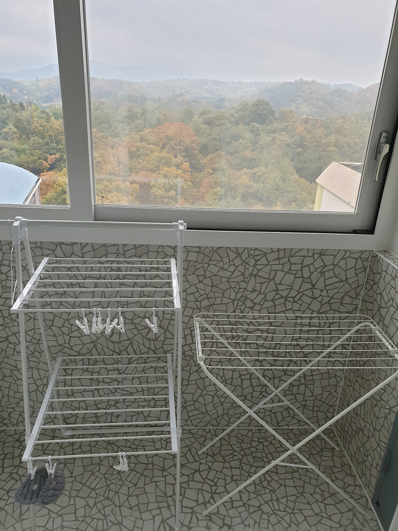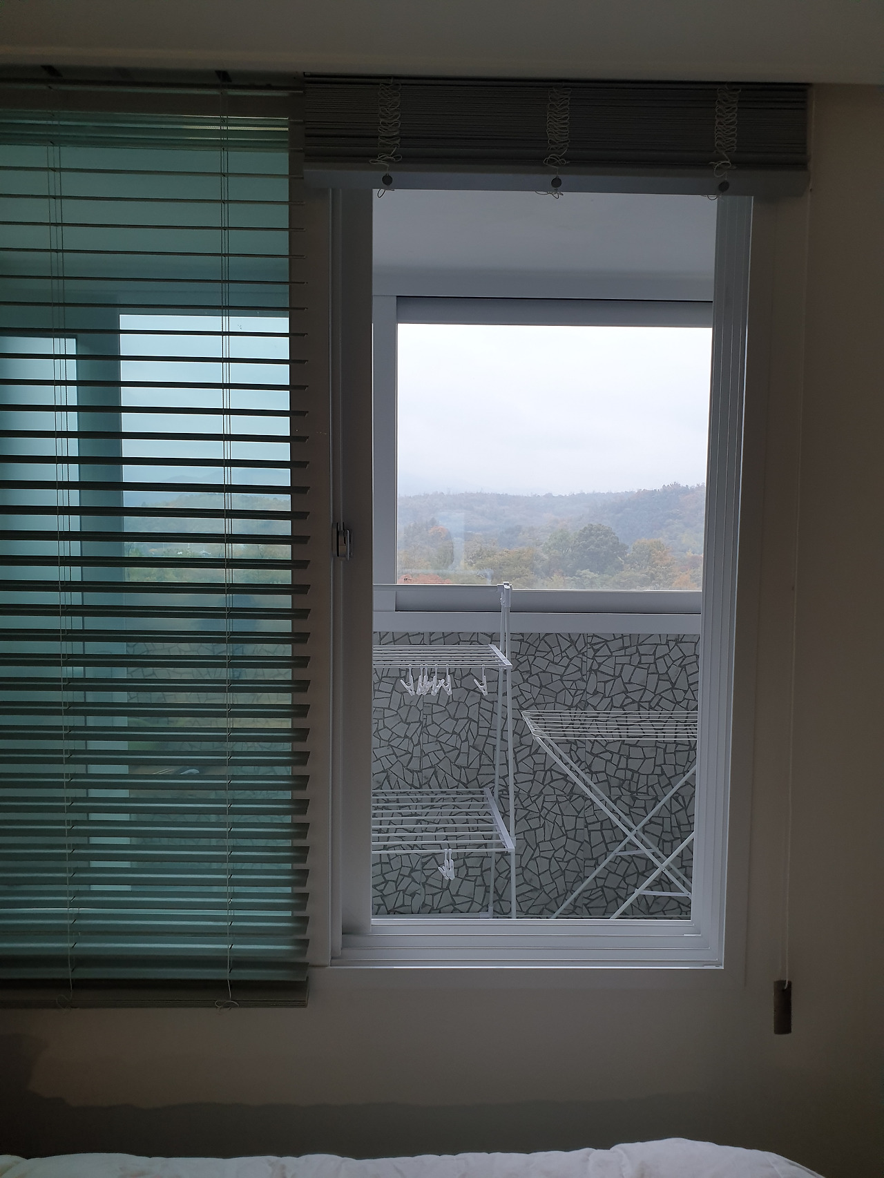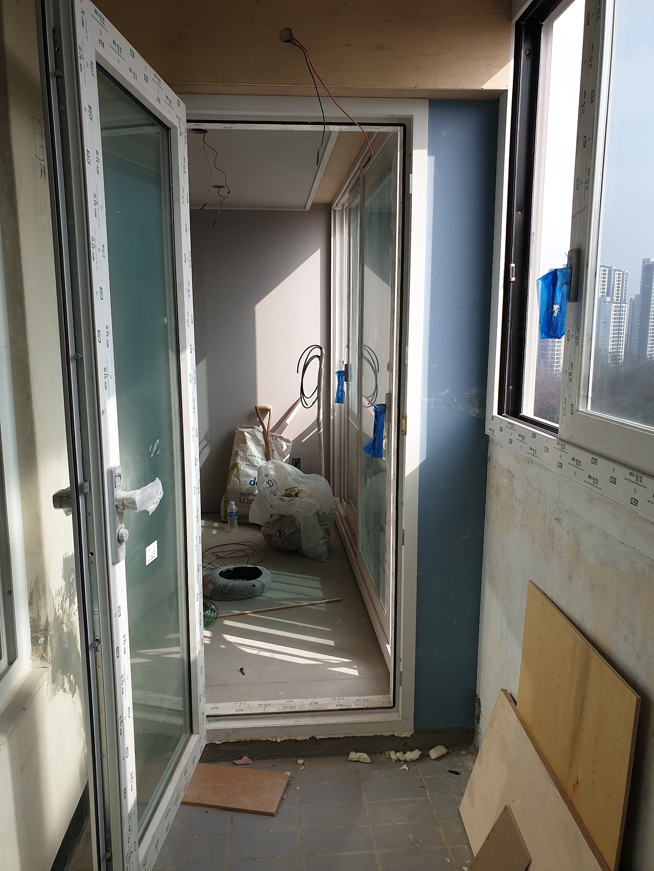 베란다 벽과 바닥을 현관 타일로 연결했더니, 시원하고 개성 있는 베란다가 완성되었다. 방안에 누워있는 것을 좋아하는 나로서는 베란다 천장에 건조기가 있는 것이 좋지 않았다. 건조기를 낮은 것으로 두 개를 사더라도 천정 건조기는 설치하지 않기로 했다. 누웠을 때 파란 하늘이 보이는 우리집 베란다가 참 좋다.