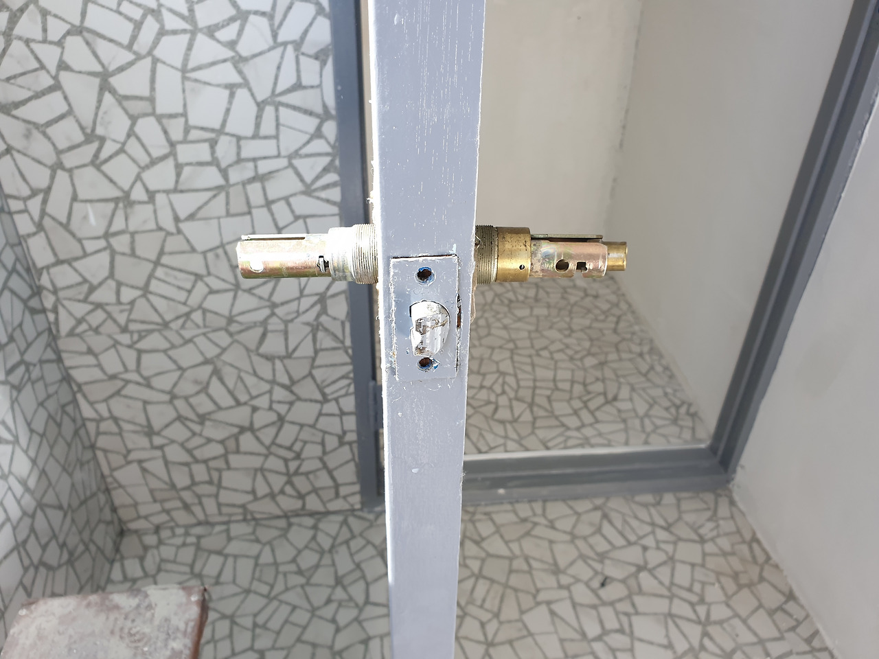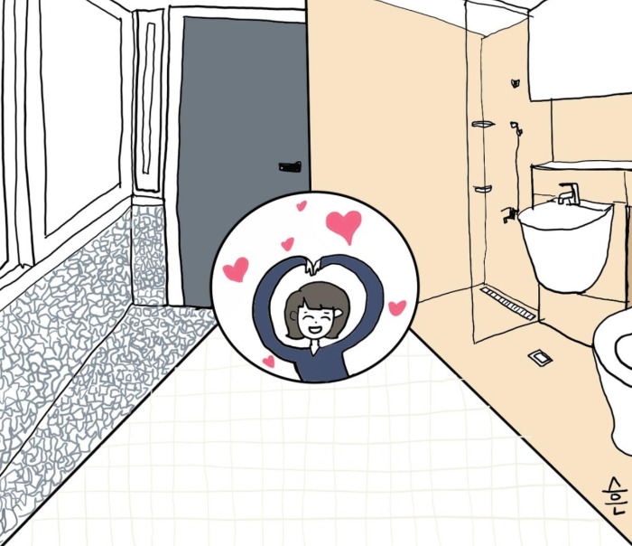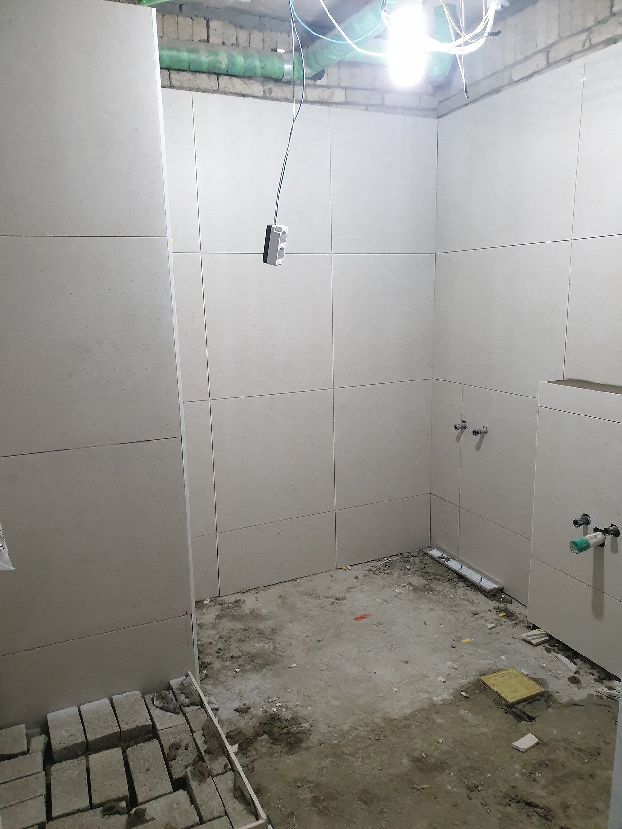 타일은 600각 돌 느낌이 나는 큰 타일로 먼저 구매해서 결정했다. 집 구조상 욕실에 세탁기가 들어가야 해서, 비교적 넓은 화장실이었지만 구성하는 데 어려움이 있었다. 건식으로 만들기 위해 샤워부스를 설치해야 하는데 세탁기 자리를 고려하면 벽에 벽돌을 한 칸 정도 더 쌓은 후에 타일을 붙여야 했다. 샤워부스를 만드는 몇 개 업체에 전화해서 니은자로 샤워부스를 만들어 줄 수 있나 문의하여 가능하다는 업체를 정해서 의뢰했다.