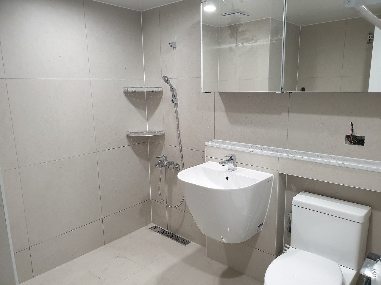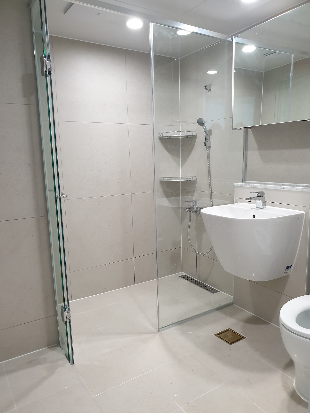 도기 세팅은 욕실 세팅만 전문적으로 하시는 분들을 한 사장님께서 소개해 주셔서 의뢰했다. 거실에 쌓아놓은 욕실 관련 물품들을 하나씩 설치하시는 모습이 역시 전문가 포스. 세 분이 한 팀이 되어 작업하시니 금방 재미있게 끝내셔서 보는 마음도 좋았다. 조명은 주백색 다운라이트 4인치로 세면대, 샤워부스, 문 앞에 달아서 따뜻한 분위기를 만들었다.