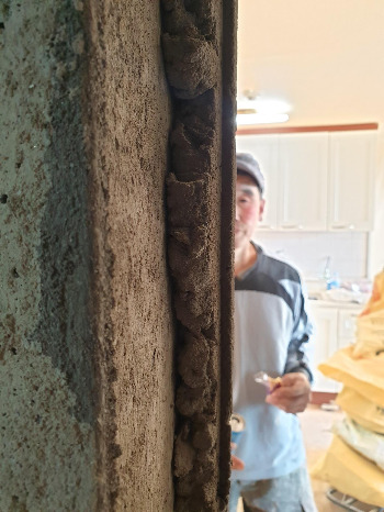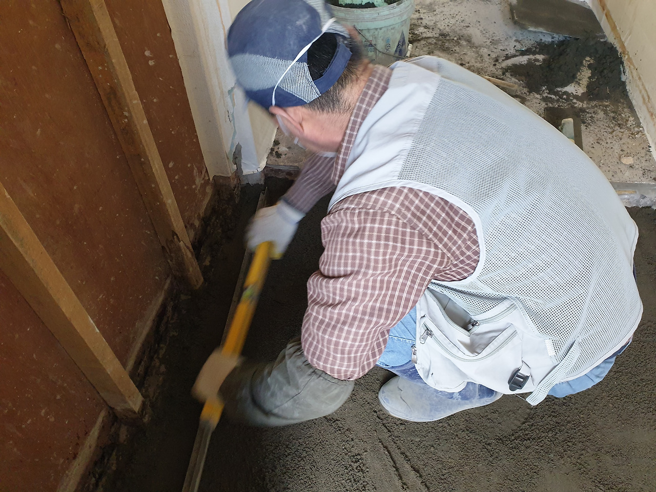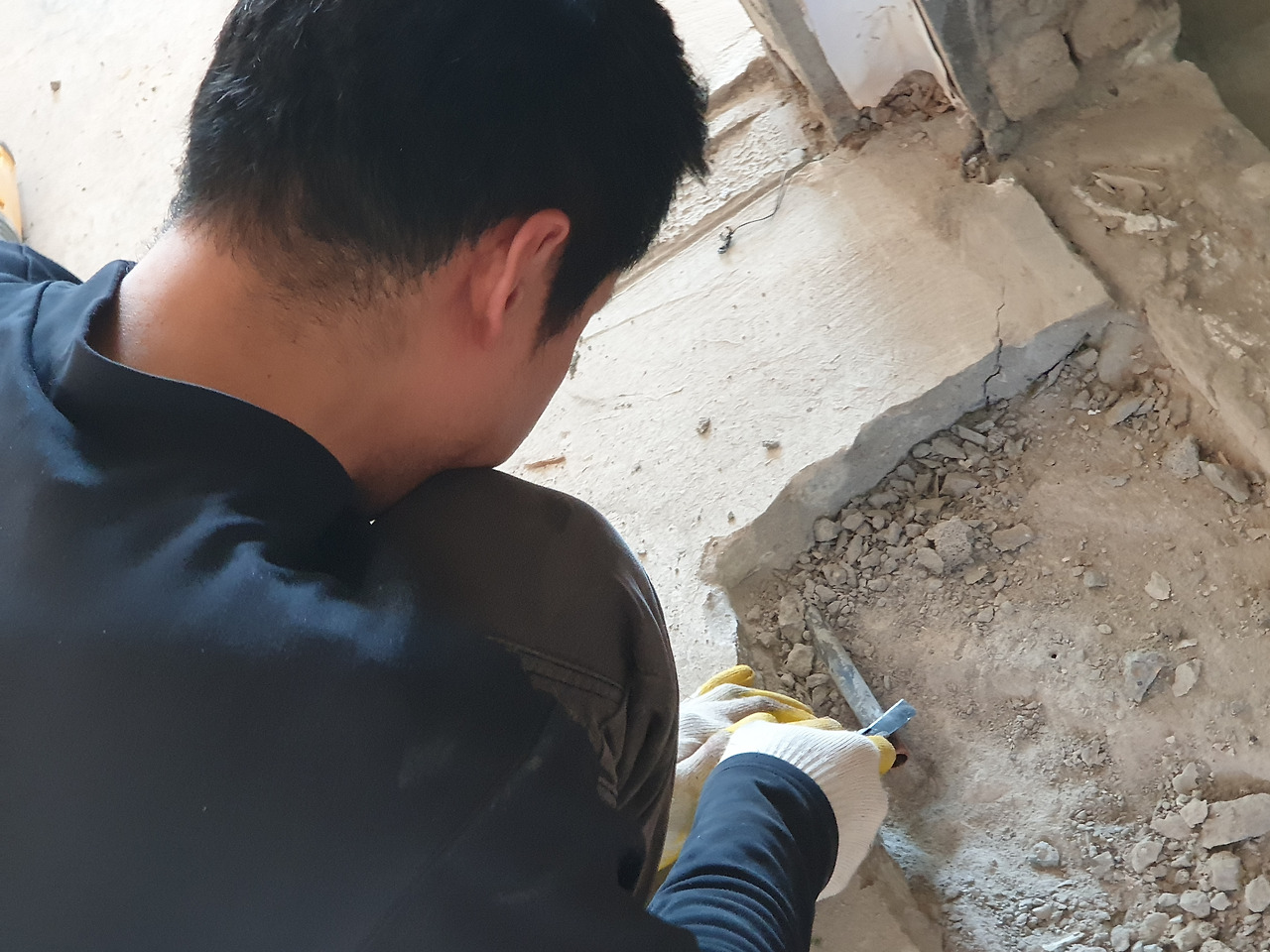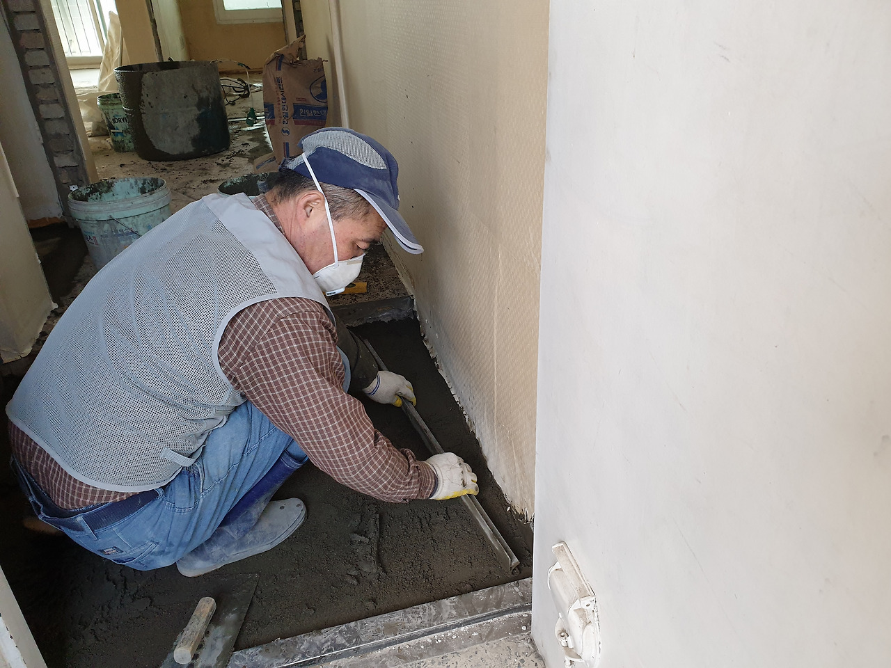 설비공사의 마무리는 미장**이었다. 내부 철거가 다 끝나면 콘크리트와 벽돌로만 이루어진 벽체나 시멘트가 부서진 부분이 보인다. 면이 고르지 못하면 그 위로 바른 마감재의 모양이 좋을 리 없다. 그때 매끈하게 면을 만들어 주는 작업이 바로 미장이다. 미장을 하시는 분께 호칭을 여쭈어 보았다. 웃으시면서 ‘S미장, 소 기사’라 불러 달라고 하셨다. 연배가 있는 모습이 듬직했고, 현장의 구석구석을 살피시는 모습에 전문가 포스가 물씬. 싱크대 수전을 내려주실 때도 꼼꼼하게 미장해 주시더니, 몰딩을 제거하면서 떨어져 나간 부분도 하나하나 챙기시면서 시멘트를 발라주셨다.