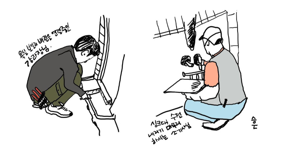 철거 설비의 이틀 동안 공사를 책임져 주신 분은 성함을 여쭤보니 ‘강 과장’이라 불러달라고 하셨다. 껑충 큰 키와 곱게 생기신 외모와 달리, 오함마로 벽을 내리치는 파워를 보여주시기도 하셨다. 무엇보다 강 과장님이 좋았던 것은 소통이 잘 되는 점이었다. 욕실 바닥의 온수 배관을 까는 일, 욕실의 환풍구를 위로 올려주시는 것은 내가 미처 신경 쓰지 못하는 부분이었는데 먼저 말씀을 해 주고 알기 쉽게 설명을 해주어 결정을 빨리 내릴 수 있었다. 공사를 해 보니, 공정에서 최대한 신경을 써서 해결해야지 다음 공정으로 넘어가면 굉장히 어려운 일이 된다는 것을 알게 되었다.