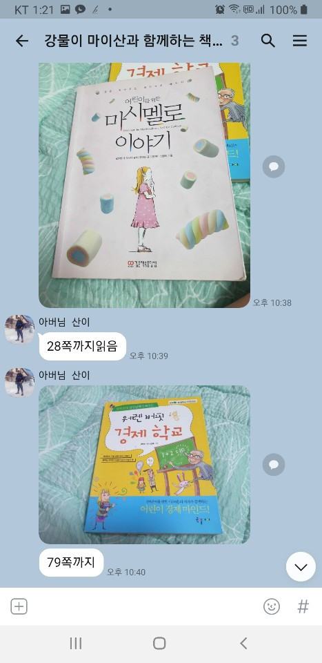 대화방이 하나 더 생겼다. ‘강물이와 마이산과 함께하는 책 읽기’, 아이들은 그동안 독서노트에 읽은 책 제목을 적어두었다. 빠뜨리는 날이 많아 내가 확인을 해야만 하고, 그 확인은 잔소리가 된다. 아이들 휴대전화 속의 갤러리에 책을 찍은 사진들이 늘어간다.