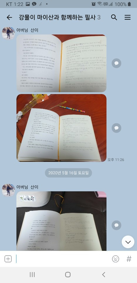 ‘친구 누구를 끼워서 같이 할까, 아니야 책 옮겨 쓰는 거 안 좋아할 걸, 엄마는 좋겠다.’ 등등 둘의 대화가 내 귀를 간지럽게 한다. 나는 ‘강물이 마이산과 함께하는 필사’라는 대화방을 개설하고 아이들을 초대한다. 그날 필사한 내용을 사진 찍어 공유했다. 알림음을 들은 아이들은 메시지를 확인하고 기뻐한다.