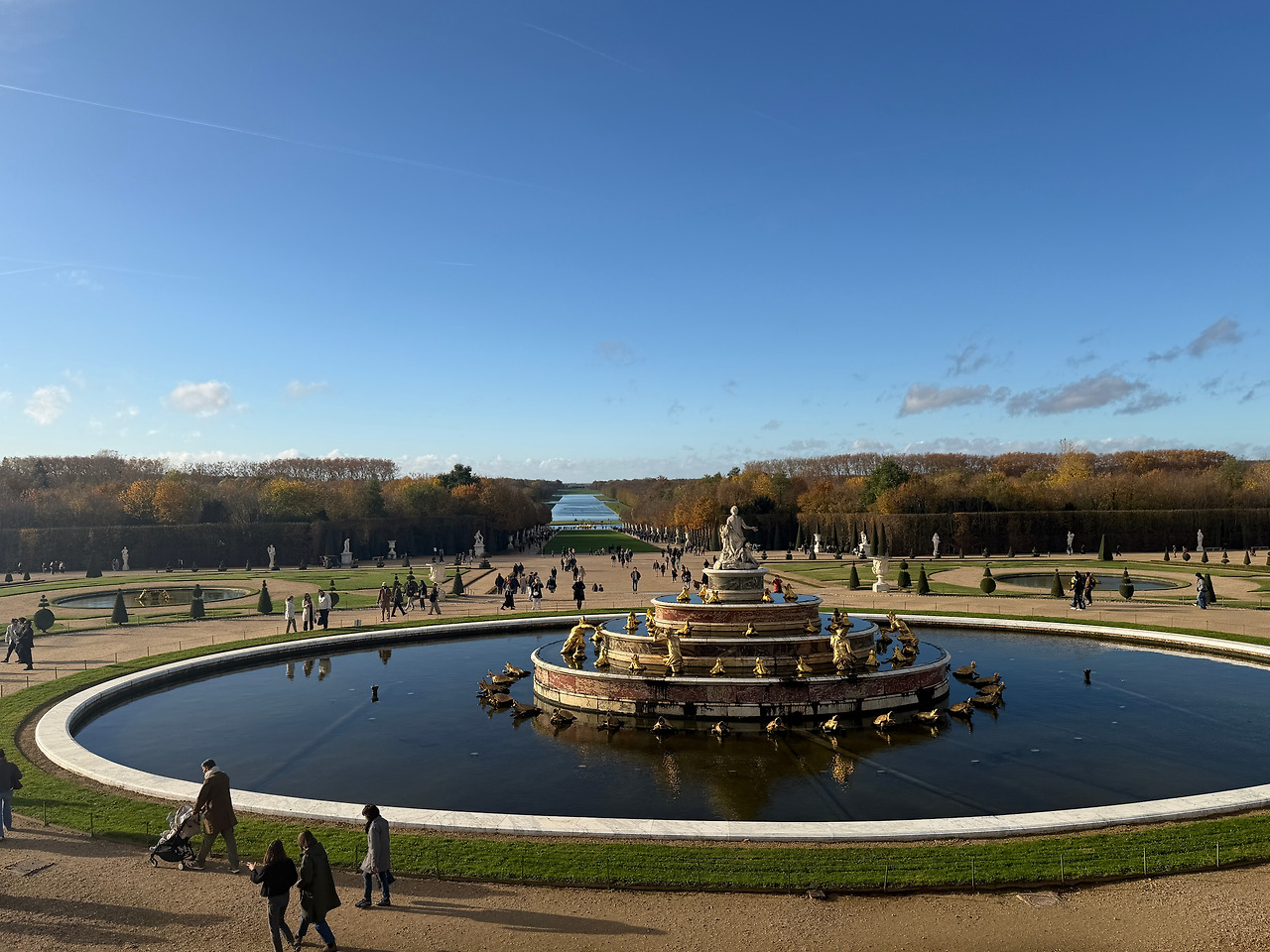 정원의 자연마저 권력으로 다스리려는 의도로 설계되었다는 베르사유 궁전의 정원은 우리가 갔던 날이 정원 개방 마지막 날이어서 입장료를 받지 않았다. 깡패 같은 유로의 환율에 베르사유가 베푼 은혜 같은 정원 개방을 누리던 날, 많은 사람들이 정원에 있었지만 튈르리 정원이나 쇤부른 궁전의 정원에서 이미 본 것 같은 좌우대칭, 양 쪽이 같은 모양으로 형태를 같이해서 늘어서 있고 멀리에는 호수가 있는 풍경이 이젠 특별하게 보이지는 않았다. 공식을 대입해서 답이 나오는 수학 같은 느낌의 정원이 바로 이런 것이 아닐까 싶은 그런 정원!!
