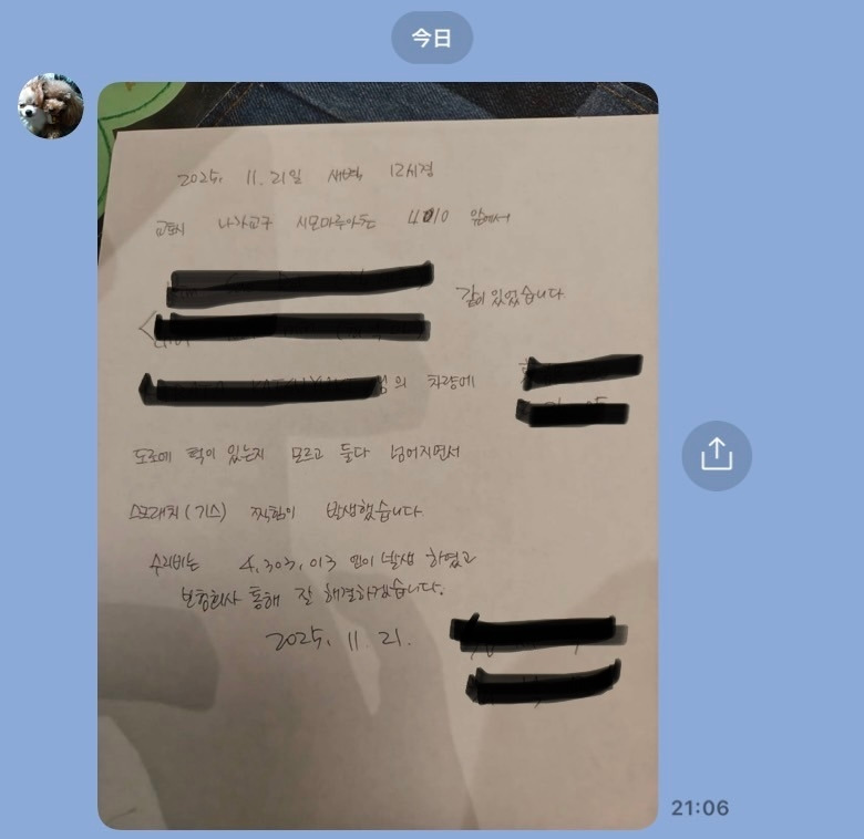 글씨체나 이름으로 봐서 우리 딸이나 아들 같은 또래의 아이들이 여행 가서 일어난 일 같은데 얼마든지 일어날 수 있는 일이라고 생각이 듭니다. 지하 주차장에 주차를 하는 우리나라 사람들과는 다르게 개인 차고에 주차해 두거나 동네 곳곳에 있는 주차장에 월 결제 방식으로 주차를 하는 일본 사람들의 주차 방식을 생각해 보면 개인 차고지에 차를 둔 히라이 선생 친척의 차에 누군가 넘어져서 일어난 사고인데 일부러 그런 것도 아닐 사고에 대해서 아이들을 뭐라고 할 수도 없고 보험으로 얼마까지 해결이 될지 모르겠으나 4천만 원에 가까운 돈을 어떻게 해결할 수 있을지 걱정을 혼자서 많이 했습니다.
