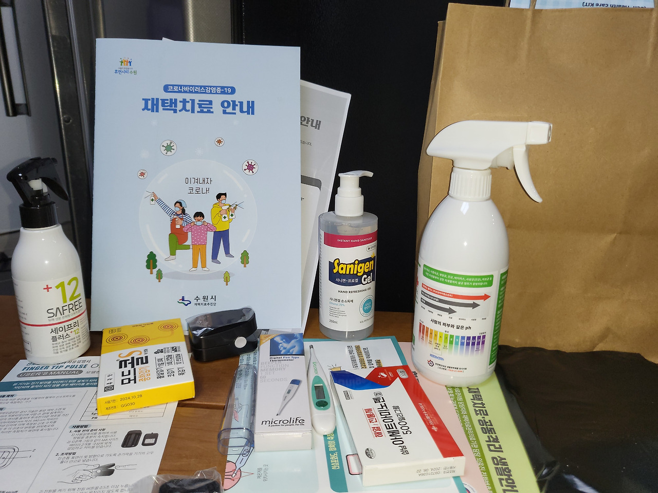체온계가 두 개, 산소 포화도 측정기와 감기약, 해열제, 소독수등이 들어있는 박스를 받은 걸로