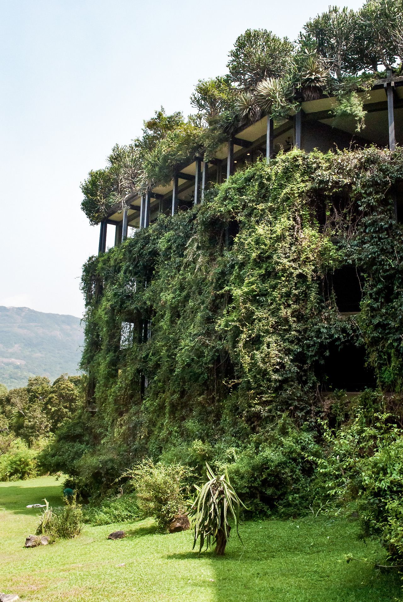 벽을 뚫고 나온 바위 덩어리는 굳이 제거하지 않아 자연이 건물로 침입할 수 있도록 방관하고 있다. 검은색과 흰색은 주변에 거슬리는 않는 색으로, 녹색은 자연의 색을 차용해 때로는 나무 사이에서 위장을 하기에 알맞다. 외벽에는 열대 특유의 늘어지는 넝쿨식물 줄기가 치렁치렁 건물을 감싸고 있다.