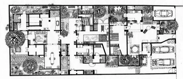 이 집 대부분의 공간에는 크고 작은 정원들이 있다. 그 정원들이 합쳐지면, 집이 아니라 하나의 거대한 정원처럼 느껴진다. 평면도에도 나무를 많이도 그려 놓았다. 나무가 이렇게 실내에 많이 그려진 평면도를 온실 말고는 본 적이 없다.