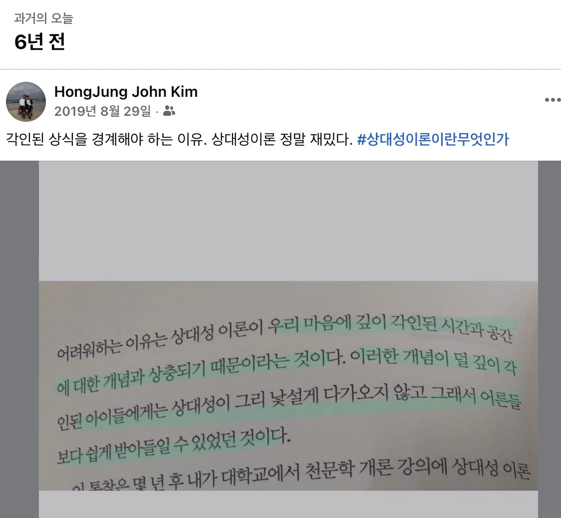 2019년 오늘 읽은 제프리 베네트의 『상대성 이론이란 무엇인가』에 나오는 구절이다. 그때 나는 과학 공부에 한창 빠져 있었다. 나의 호기심을 처음 자극했던 것은 우주선에서 나타나는 시간 지연 현상이었고, 그것은 아인슈타인의 특수상대성 이론으로 설명할 수 있었다. 특수상대성 이론은 쉽게 말해 속력이 빨라질수록 시간이 느려진다는 원리다. 말로는 단순하지만, 그 이치를 이해하는 일은 쉽지 않았다. 그래서 나는 상대성 이론을 어렵게 느끼는 까닭을 설명한 위 문장에 깊이 공감할 수 있었다.