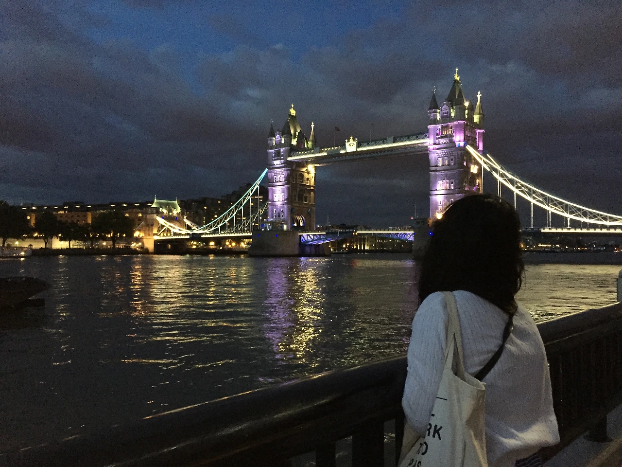 하지만 돌아가겠다는 굳은 다짐은 타워브리지 앞에 한 번 더 무너졌다. 내일 다시 오자던 그곳에서 한 번만 볼보고 가자! 하는 마음은 이미 타워브리지에 푹 빠져 그곳의 시간들을 즐기고 있었다. 해가 지기 시작할 무렵 런던의 보랏빛 하늘도, 반짝반짝 이제 막 빛이 나던 야경도, 타워브리지 주변에 행복한 관광객들도 그곳을 떠나기에 떠나는 발길을 붙잡을 이유들이 너무 많았다.