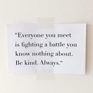 우리가 살면서 만나게 되는 많은 사람들은 누구나 내가 알 수 없는 그들 자신만의 전투를 치르고 있을 것이다. 그리하여, 항상 친절할 것.