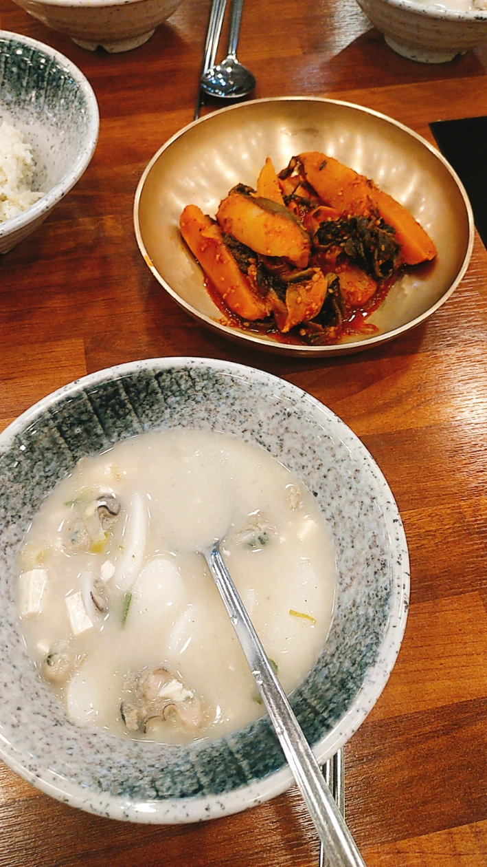 혼밥같이 찍혔지만 식당 식구들과 같이 먹는 밥! 나는 굴을 좋아하지 않지만 이 날 식사로 나온 굴 떡국은 국물까지 완식했다.