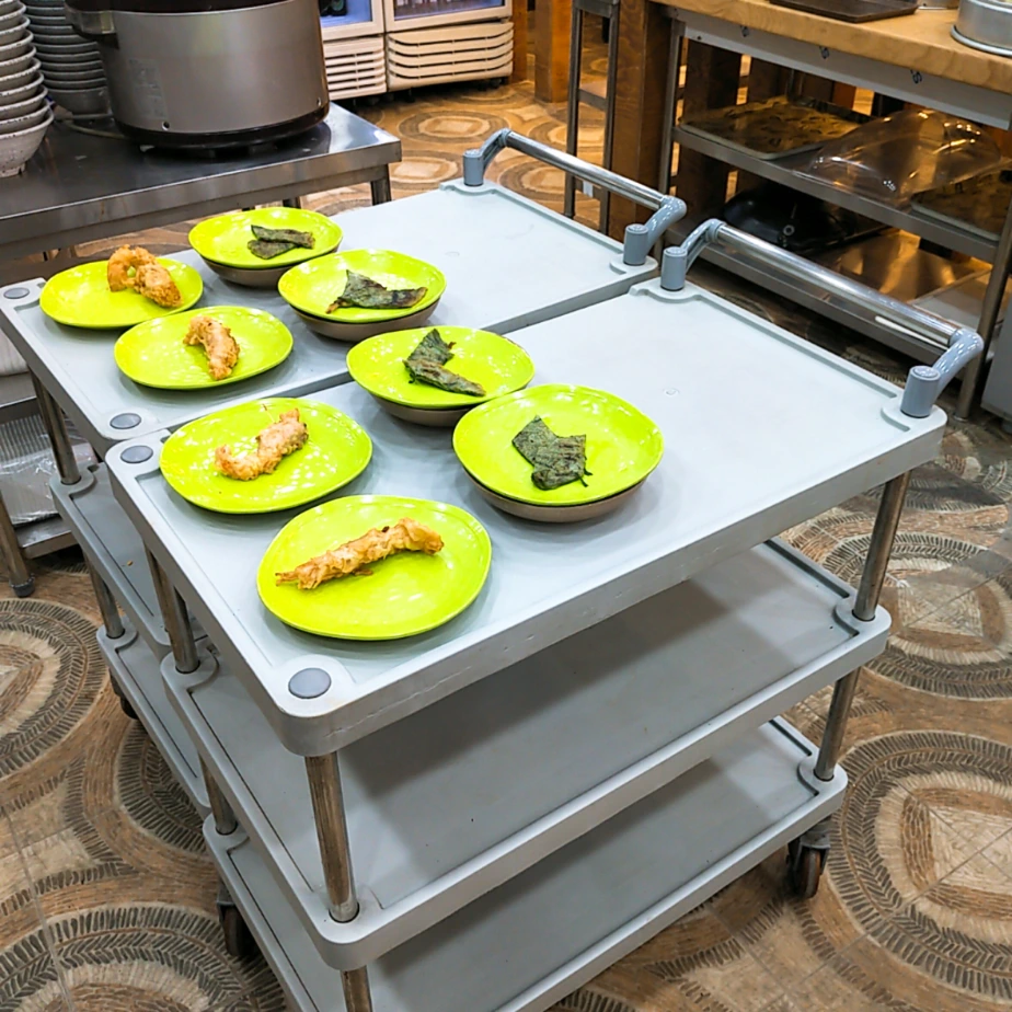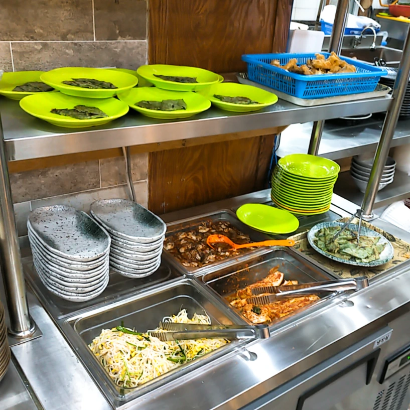 그렇게 나와 서버의 눈빛 교환이 이뤄지면 주문받을 준비를 마친 종업원이 손님에게 가서 주문을 받아온다. 그렇게 주문이 들어오면 바로 세팅이 나갈 수 있도록 손님을 자리로 안내하고, 주방 앞에 비치된 바에서 카트에 밑반찬들을 인원수에 맞춰 올려두고, 다음 손님을 위해 또 밑반찬을 담아둔다.