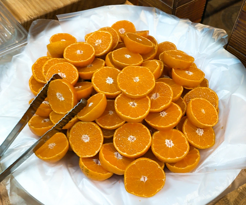 나의 주 활동(?) 무대. 특히 이 날은 식당에 도착하자마자 뷔페 선반에 올릴 귤을 수북히 썰어야 했다.