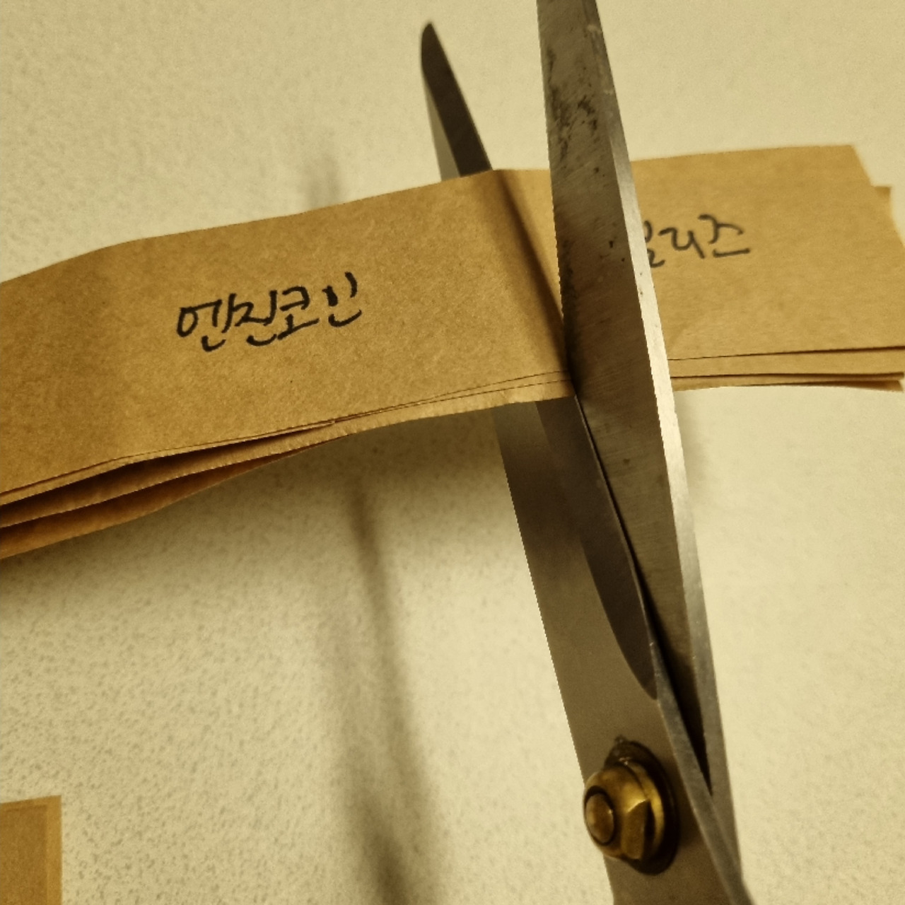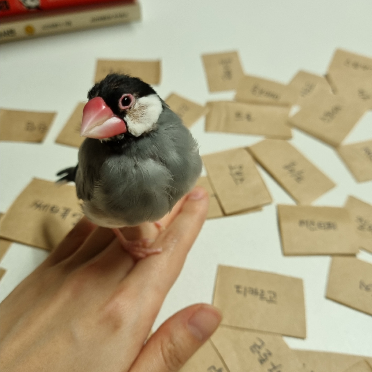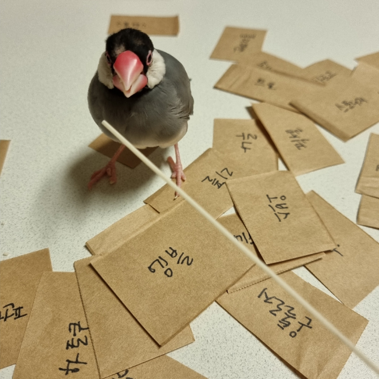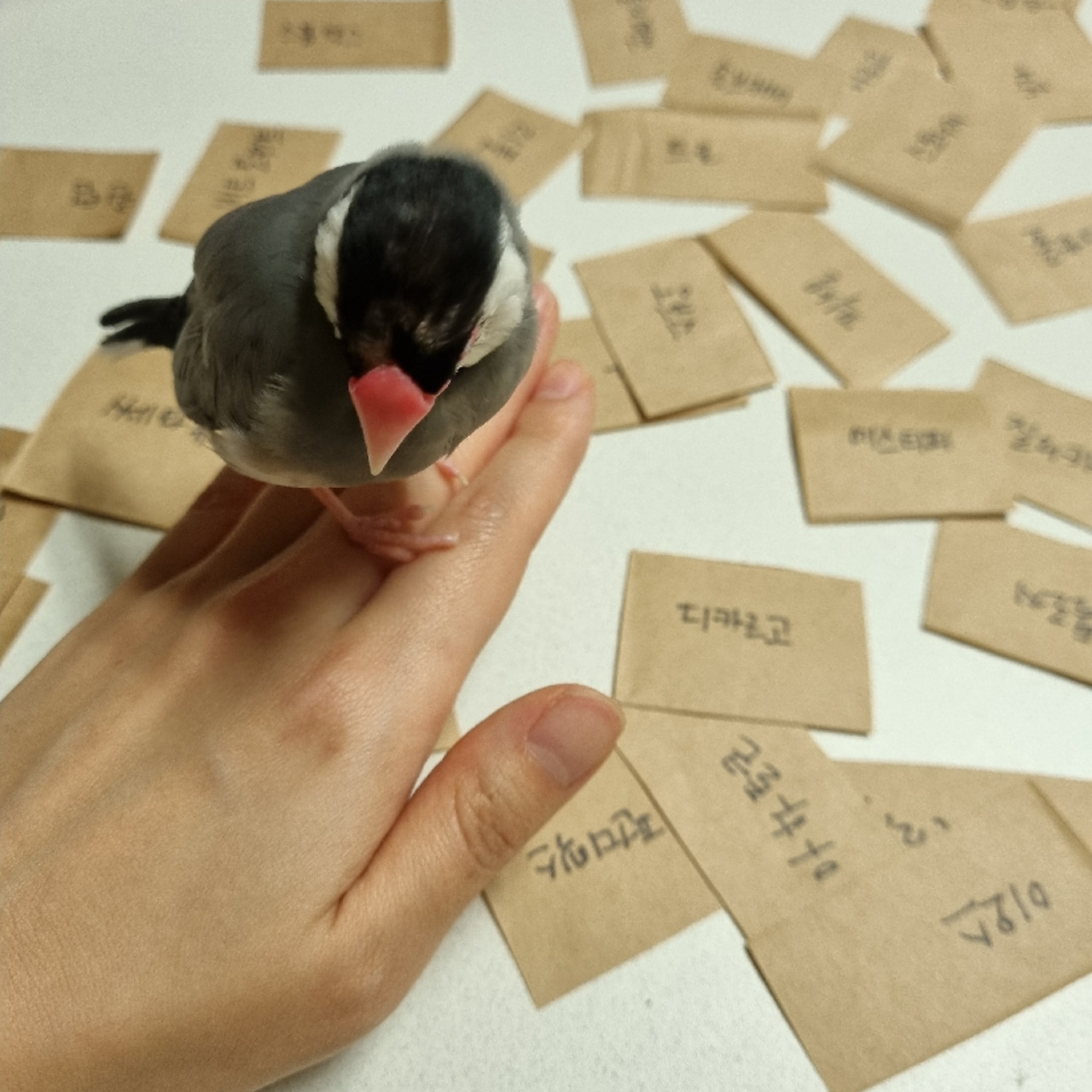 일단 집에는 프린터가 없어서 100% 수작업을 해야 했다. 업비트 앱을 켜서 눈에 띄는 코 인명을 수기로 적고, 가위로 대충 잘랐다. 사부작사부작 작업을 하고 있다 보니, 문조님이 눈을 빛내며 '저건 뭐지?' 하는 표정으로 순순히 다가왔다.