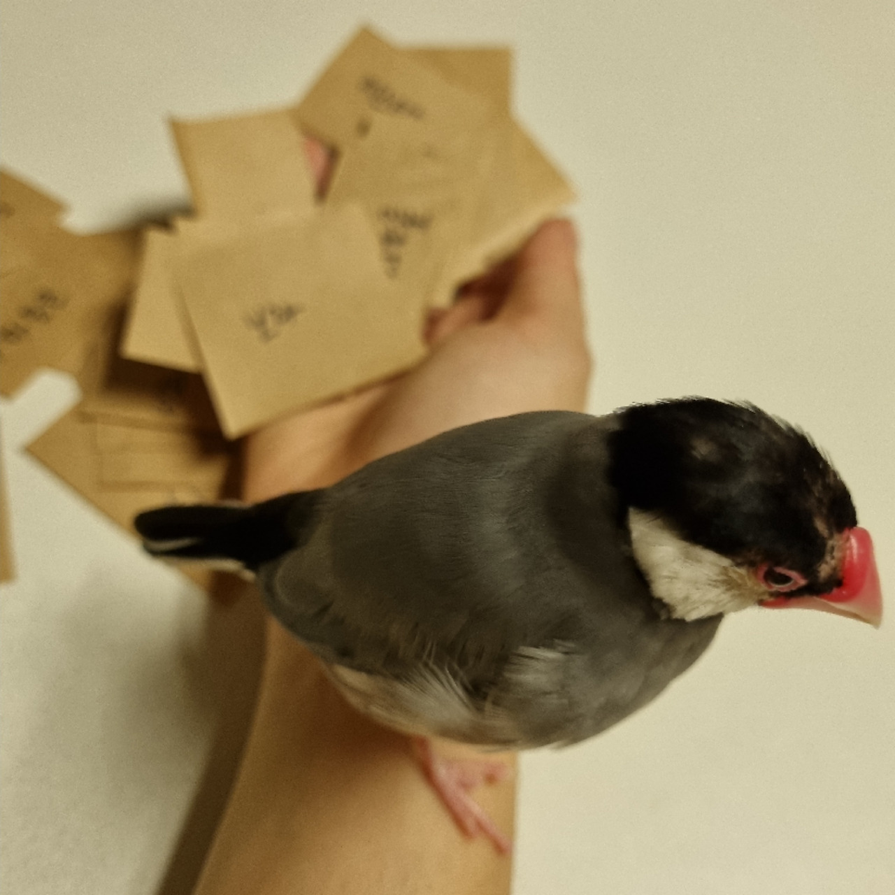 그가 좋아하는 간식으로 유혹을 해서 종이들에 더 가깝게 접근하도록 만들어도 보고, 아니면 내 손에 종이를 좀 올려놔서 선택하도록 유도도 해봤지만 그래도 그는 완고히 선택을 거부했다. 아마 종이 질이 너무 얇고 미끄러워서 그랬던 것이 아닐까 싶다. 우리 집 새들은 아지트로 이런저런 종이를 물어가는 것을 좋아하긴 하지만, 휴지처럼 가볍고 잘 잡히고 부피감이 있거나, 아니면 명함처럼 딱딱한 종이를 선호하기에, 이 종이들은 확실히 그의 타입은 아니었던 것이다.
