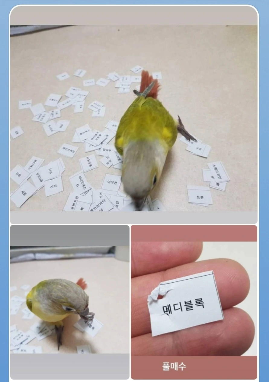 반려조 픽이라니! 이것은 '이름 매매법'을 또 한 단계 넘어선 신박한 매매법이었다. 물론 메디블록이 떡상해서 결과적으로 해피엔딩이 되긴 했지만 사실 뭐 어차피 이름보고 고르나 그냥 고르나 반려조가 골라주면 좋지 않은가. 월드컵 우승팀을 점치는 문어 폴도 있는데 반려조라고 해서 안될 것은 무엇인가? 매일 밥주고, 놀아주고, 서식지를 제공해 주는 인간 횃대의 재정 상황에 보탬이 되는 결정을 내릴 수 있다는 것은 반려조 입장에서도 기쁜 일일 것이다.