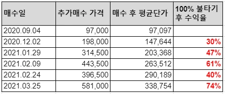 2. 불을 탄 이후 평균단가가 어떻게 될지, 예상 수익률이 어떻게 될지 계산해봐야 한다.