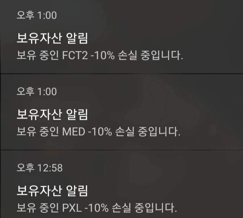그나마 아침에 눈떠서 확인해봤을 땐 일부 코인들은 미미한 +가 떠있었다. 나는 이것이 반등의 징조라고 생각하고 그들을 팔지 않았다. 오히려 '오, 반등하나 본데?'하고 비중을 꽤 늘려뒀다. 그런데... 이상하게.. 자꾸만.. 업비트 시세 알림이 울리기 시작하는 거다.