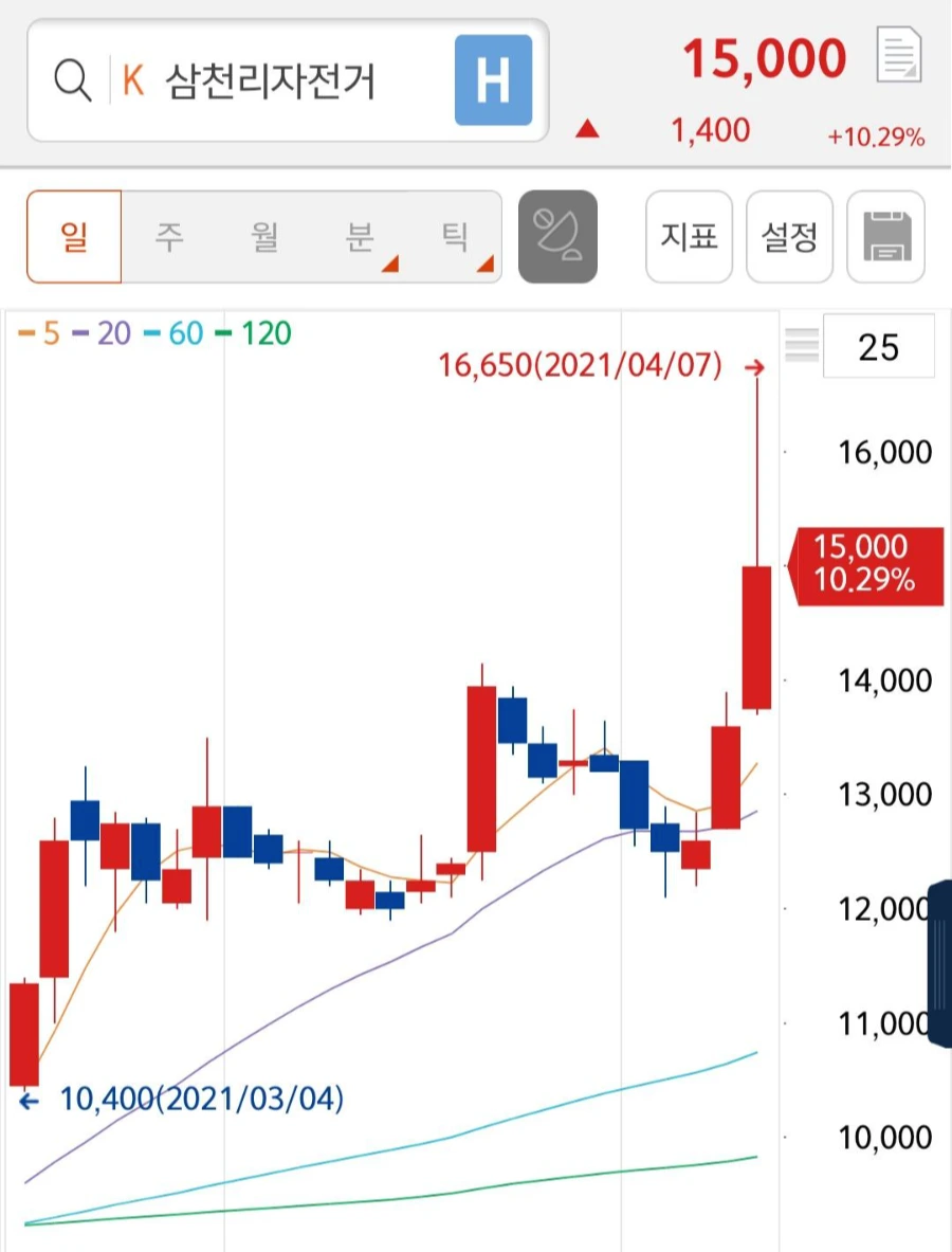 1) 기존 보유종목 삼천리자전거 1차 목표가 15,000원 도달! 미리 걸어두었던 매도 물량이 좀 팔렸다. 수익률 60%! 내 생각보다 좀 더 가서 나머지는 더 홀딩해볼까 한다. (어떻게 귀신같이 종가는 딱 15,000원!)