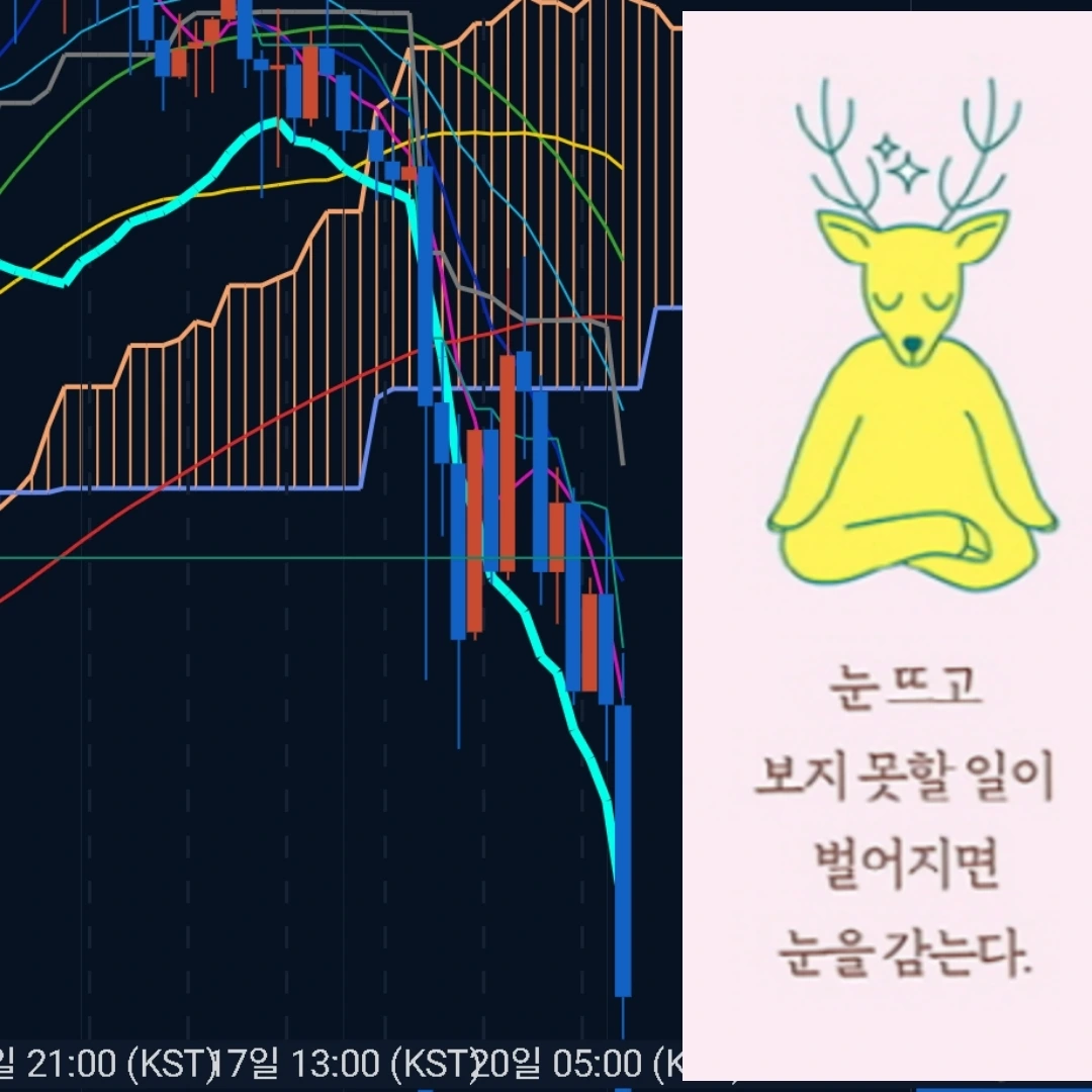 뭐 코인을 시작한 이래로 한두 번쯤 급격한 하락장이 없었던 건 아니지만, 어젯밤부터 오늘까지 계속된 폭락 대행진은 좀 그 정도가 심했다. 자꾸만 아래로 아래로만 쭉쭉 빠지는 음봉을 보고 있자면, '대체 코인판에서 차트를 본다는 것이 과연 의미가 있는 행동이긴 한 걸까?'라는 의문이 들 정도였으니까.