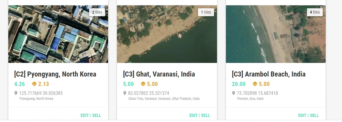 보니까 어스2를 막 시작한 유저들의 행동 패턴이 으레 그런 것 같았다. '뭐지, 이 신세계는?'하고 가입해서 가장 먼저 찾아보고 구매하는 타일이 자기 집, 회사, 학교, 고향 등.. 주로 자기 생활 반경이라는 것이다. 그다음에는 본인이 다녀왔던 여행지나 추억이 담긴 장소의 타일을 구매하고, 의미부여가 되는 땅을 소소하게 구매하고, 대리 여행 가는 기분으로 구매하고.