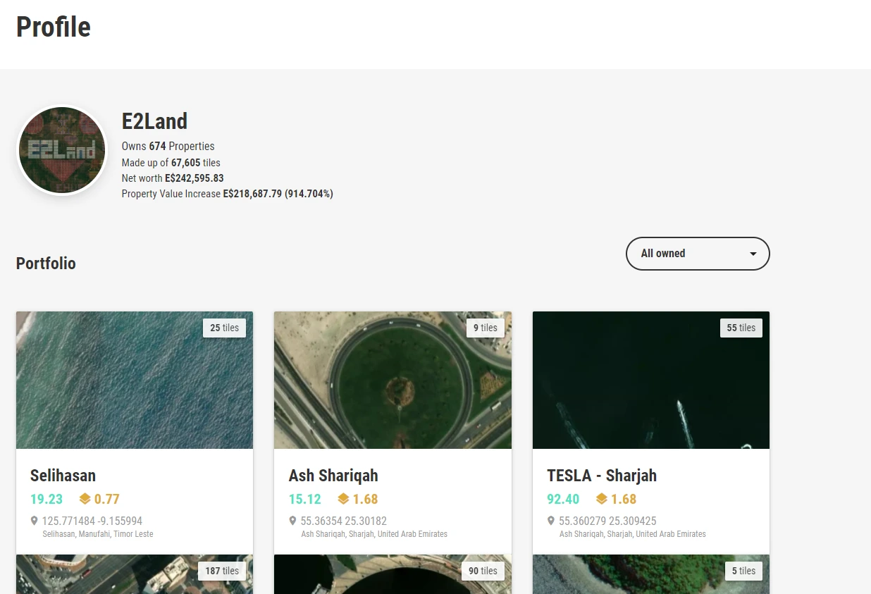 신규 오픈하는 타일이 E$0.01로 출발하는 점을 고려해 봤을 때, 6개월 만에 이렇게 땅값이 상승한 것이다. 그러니 아마도 어스2 극 초창기에 E$0.01으로 위 땅들을 구매한 사람들의 수익률은 지금쯤 어마어마할 것이다. (마치 비트코인 초기 유저들이 몇 년 뒤 봤던 수익률이랄까.)
