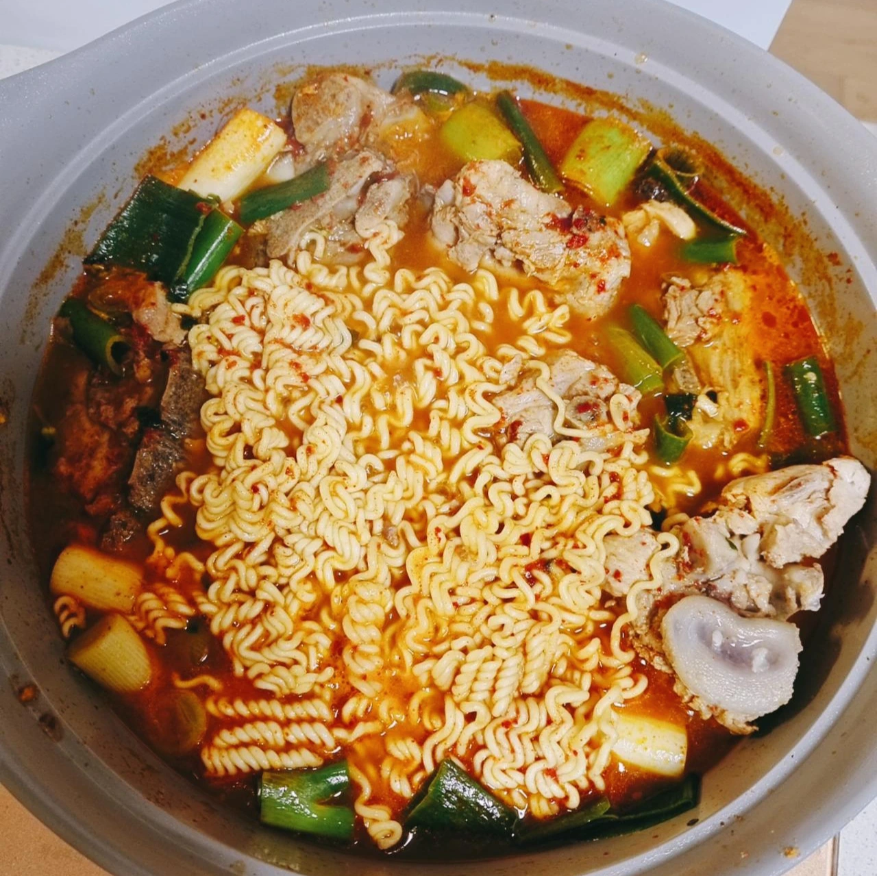 그냥 끓이기에는 어쩐지 좀 아쉬워서, 평생 감자탕집을 운영하시다 최근 가게를 정리한 고모가 냉동해뒀다 먹으라고 주셨던 뼈와 육수를 꺼냈다. 그대로 전골냄비에 같이 넣어 보골보골 끓이다, 라면과 라면수프를 넣고 마저 끓였다.
