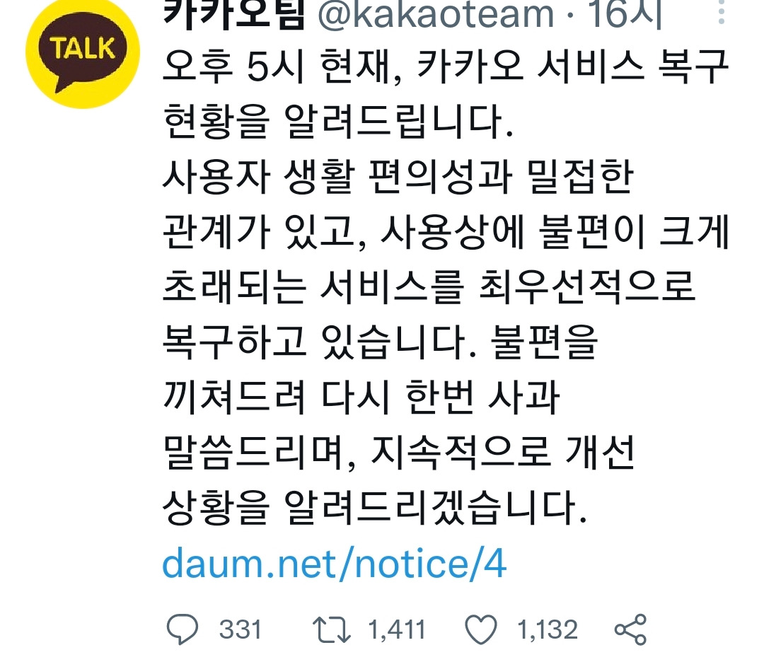 카카오 팀에서도 간간이 복구 상황을 공지해 주었고, 수습을 위해 최선을 다하고 있음을 알려주었고요.