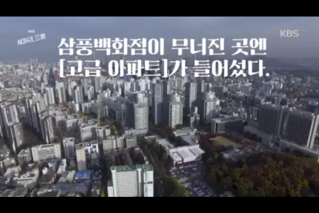 한동안, 삼풍을 잊고 지냈다. 그러다, SNS에서 이번에 KBS에서 방영한다던 다큐멘터리의 예고편을 보게 됐다. <모던 코리아>라는 이름의 다큐멘터리를 홍보하는 이 광고의 영상은 그 자체로는 무척 단순했다. 롱테이크로, 당시 헬기 위에서 촬영한 영상만 30초 남짓 되는 시간 동안 노출했을 뿐.