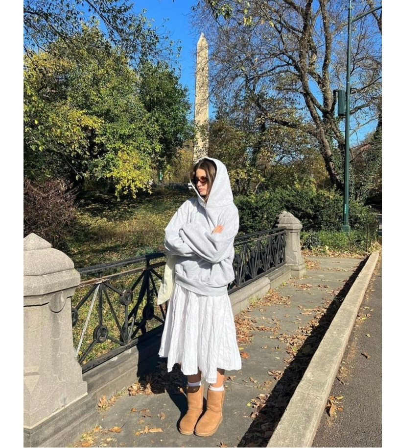 여성미를 좋아한다면 무릎 아래선까지 내려오는 스커트에 매치하는 코디를 제안한다. H라인 스커트보다는 살짝 풍성한 느낌의 스커트가 더 어그의 매력을 배가 시킨다. 상의는 같은 칼라의 후드 티셔츠나 스웨터를 매치하면 시크한 매력까지 풍길 수 있다. 이미 날이 추워졌지만 늦가을이나 초봄에는 맨다리에 화이트 삭스를 착용하고 어그를 매치해 보시길. 한 끗 차이로 달라진다는 것이 무엇인지 알 수 있을 것이다.