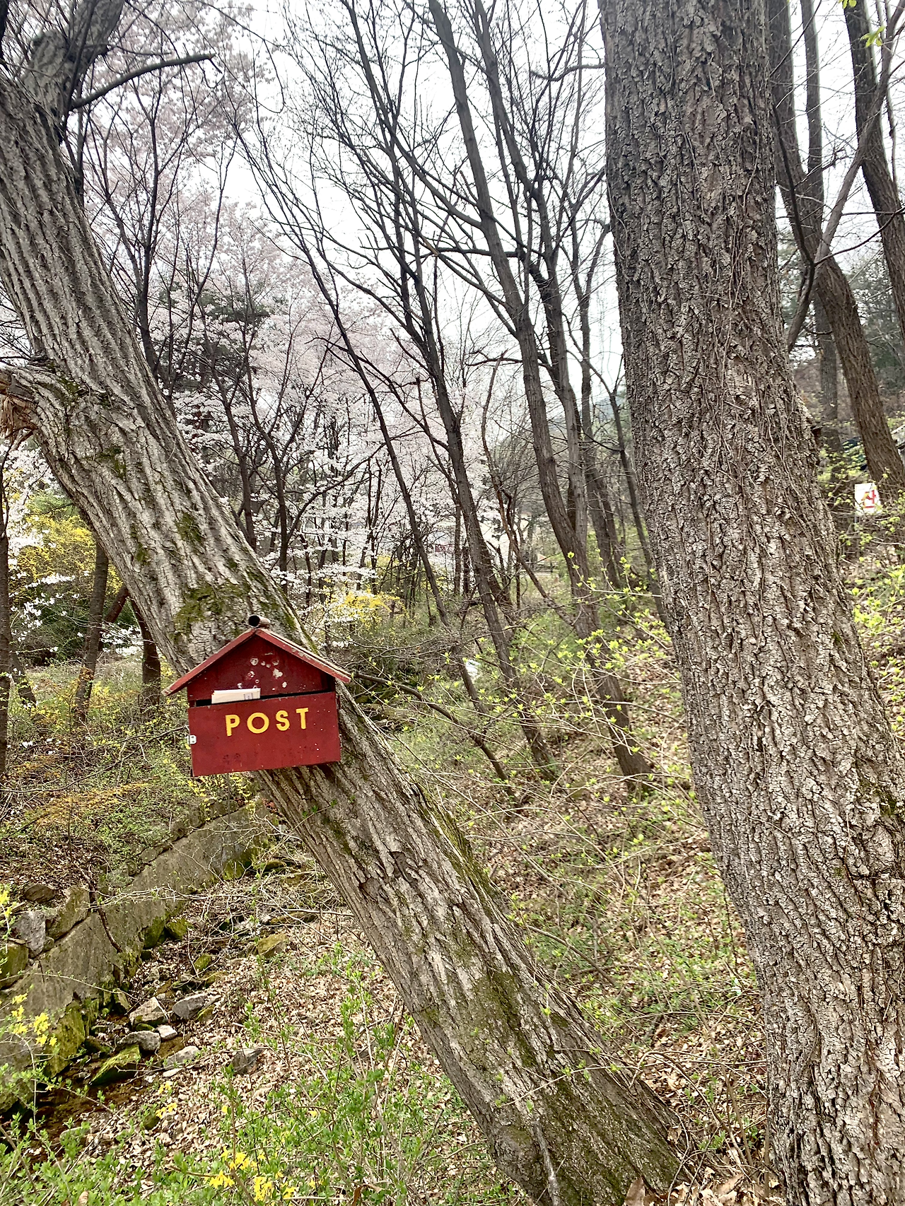 언제나 대문을 활짝 열어두는 그 집 앞에 진달래꽃이 만발해졌고 봄바람에 꽃잎들이 바닥에 떨어져 있네요. 마치 사뿐히 즈려밟고 들어오세요 하는 것만 같습니다. 정말 마당으로 쑥 들어가려는 발걸음을 애써 돌려 산길을 내려오는데 나무에 매달린 빨간 우체통을 보았습니다. 왜 이렇게 집에서 먼 곳에 우체통을 달았을까 궁금증이 들던 동시에 아하~ 이유를 알았습니다. 우체부 아저씨가 위까지 올라오는 수고를 덜어주려고 그런 것이지요.